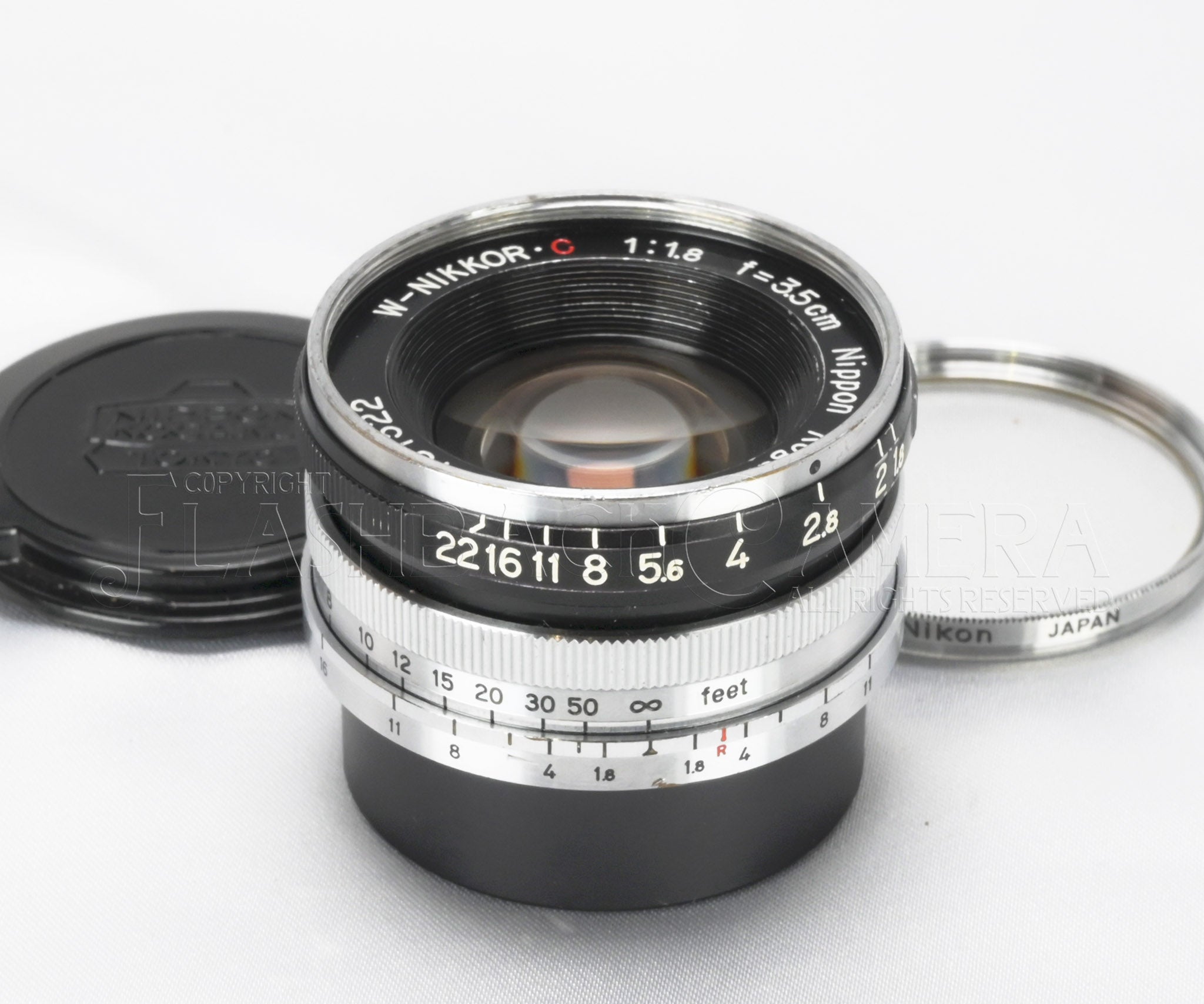 W-ニッコール C 3.5cm f1.8。稀少ライカ・スクリューマウント。5群7枚構成。1956年の発売当時、世界一の明るさを誇った35mm広角レンズです。ニコン Sマウントはかなりの製造数がありますが、Lマウントは稀少で、約1,500本の製造といわれています。