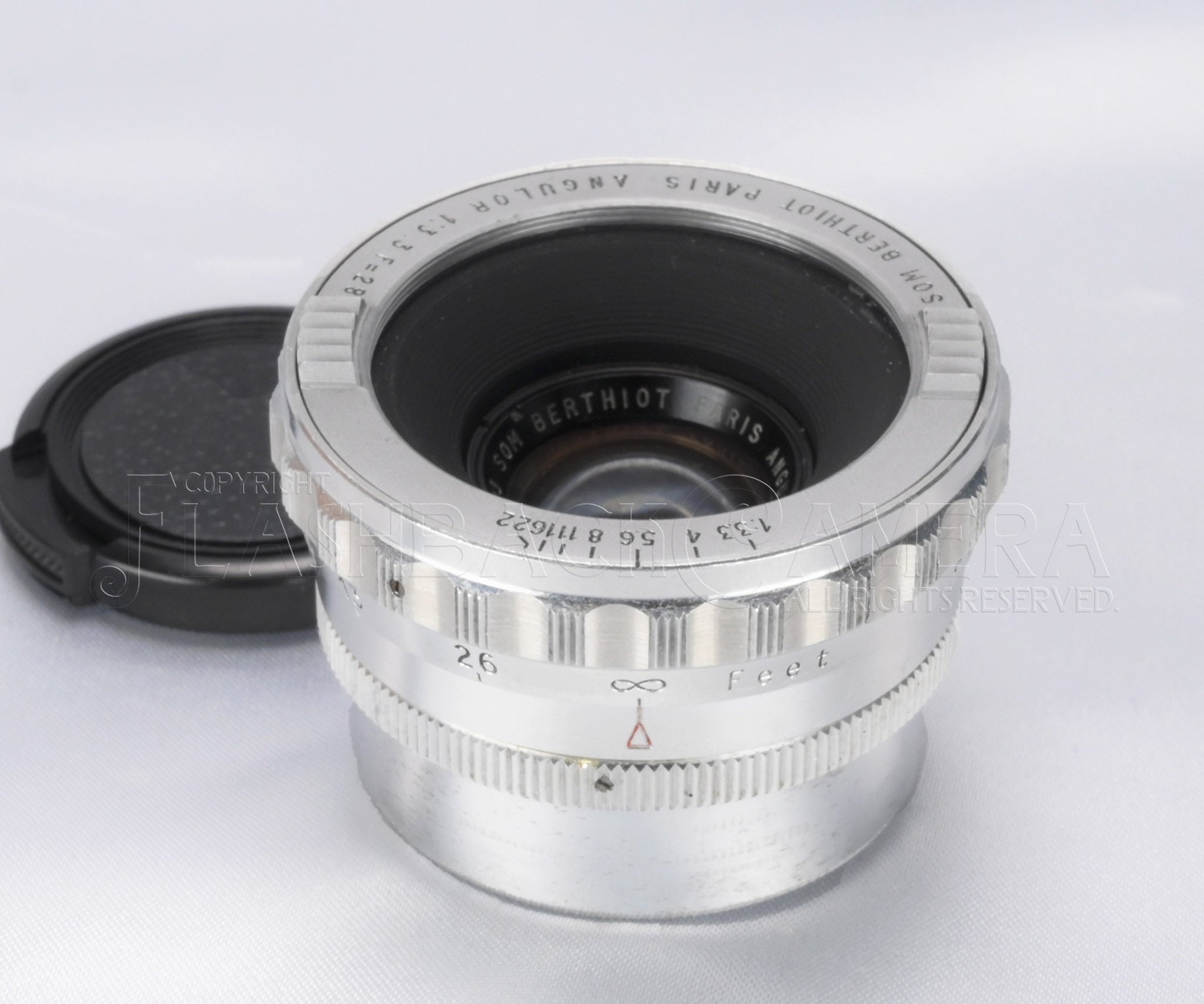 仏Som Berthiot社の広角レンズ、アンギュロール 28mm f3.3。ライカスクリューマウント。製造番号は107xxxx。4群6枚構成。ヘリコイドの距離表記はfeet。ベルチオレンズらしい、透明感のあるブルーコーティング。