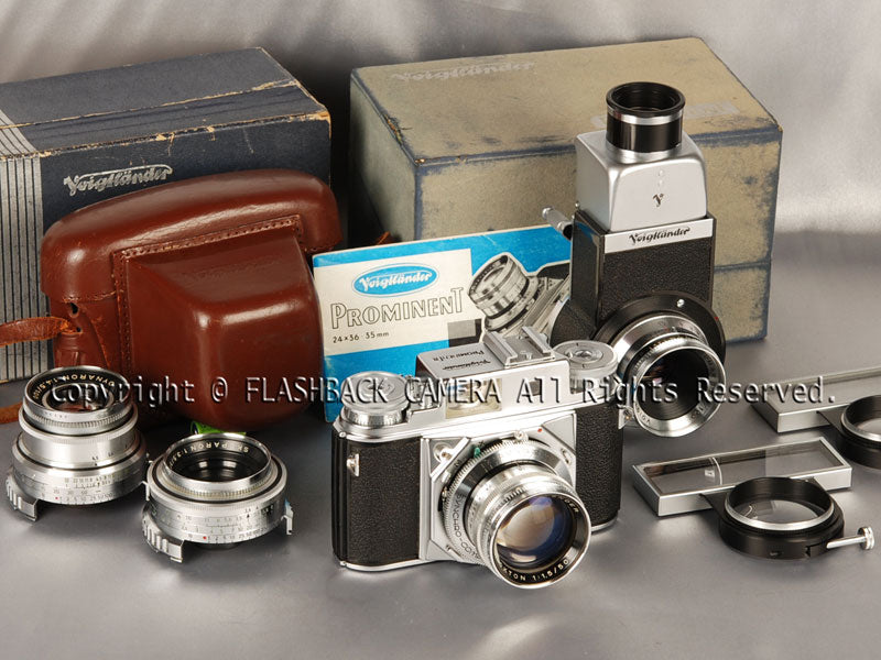 等倍ブライトフレーム・ファインダー採用で使い易くなった、プロミネント後期型。1958〜60年製。ファインダーにバルサム剥離があり、ややチラつきますが、実用には差し支えありません。他、ボディやレンズの状態も良好です。ガラスも綺麗。取扱説明書はI型のもの。プロクサーや珍品の150mm交換レンズも揃った旦那セット!本体や150mmレンズ用レフボックスの見事な仕上げ。この時代のフォクトレンダー製品は凄いですね。変態的にまで良く出来たカメラです。