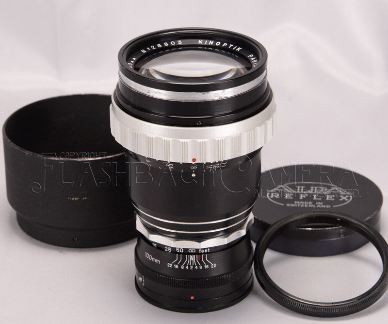 1956年~60年の製造。プリセット絞り。キノプティック 100/2前期型。4群6枚構成のガウスタイプのアポクロマート。製造本数245本の稀少玉。アルパ用レンズの中でも超ハイスペックな一本。スタイリングも見事。本体重量は553gと軽量です。ヘリコイドはEXTENSAN側についており、レンズヘッドが分離します。6x6をカバーするイメージサークルがあり、中判カメラ等にも流用可能です。