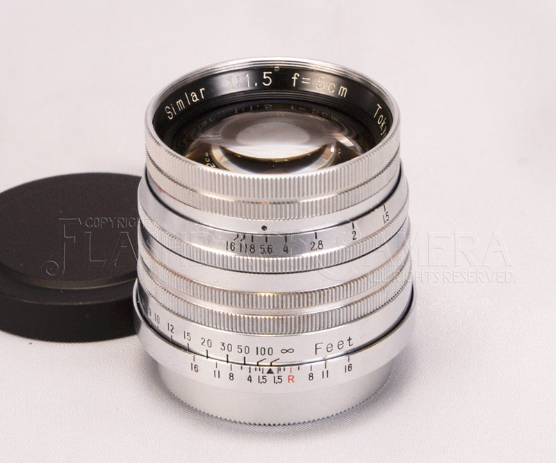 東京光学製。1953年頃の製造。岡田氏・上野氏共著 35mm版オールドレンズの最高峰「50mm f1.5」によると、本品は1938年に冨田良次氏が設計。前群ゾナー型、後群ガウス型を組み合わせ、双方の収差を新種ガラス以前にバランスをとって極小化することを試みた画期的なレンズであるという評価が記されております。