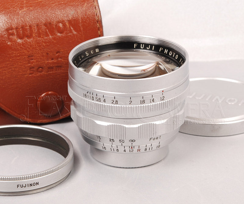 フジノン 50mm f1.2、初期型・白鏡胴。1954年発売。feet表記。この前期型はプロトタイプ的な位置づけで生産本数は100本前後と言われており、非常に珍しい。後期型とはレンズ構成が異なると言われています。ズノー 50mm f1.1、ヘキサノン 60mm f1.2、マイナーなところではレオノン 50mm f1.2などと並んで、国産大口径競争の真っ只中に登場したレンズ。本体のみの重量は398g、フィルターリング付で424gです。