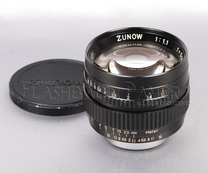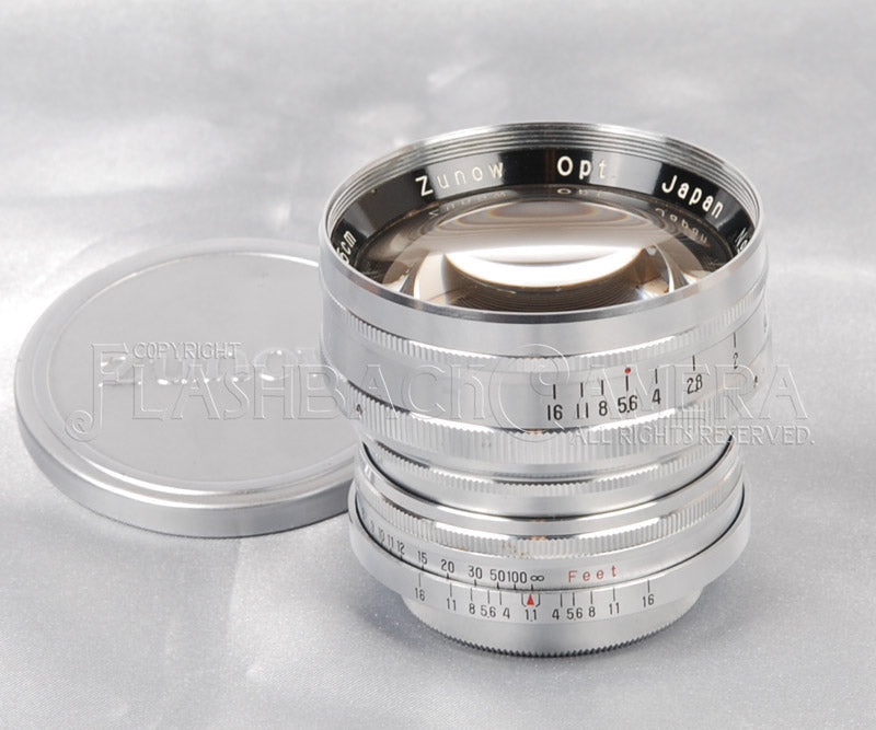 1953年に、「世界で一番明るいレンズ」のコピーで華々しくデビューした、ズノー 50mm f1.1の最終型。シリアル番号は7000番台。1960年頃の製造です。鏡胴はブラックペイント。4群9枚構成。レンズ構成的には3番目のタイプで、後玉がバルサム貼り合わせの2枚となった。この最終型(III型)は、ズノー光学の倒産により市場には出回らなかったと言われています。現存数が非常に少ない、幻のレンズです。2016年8月にOH済。お客様からのリクエスト商品で、店頭にて売約済みとなりました。ありがとうございます。