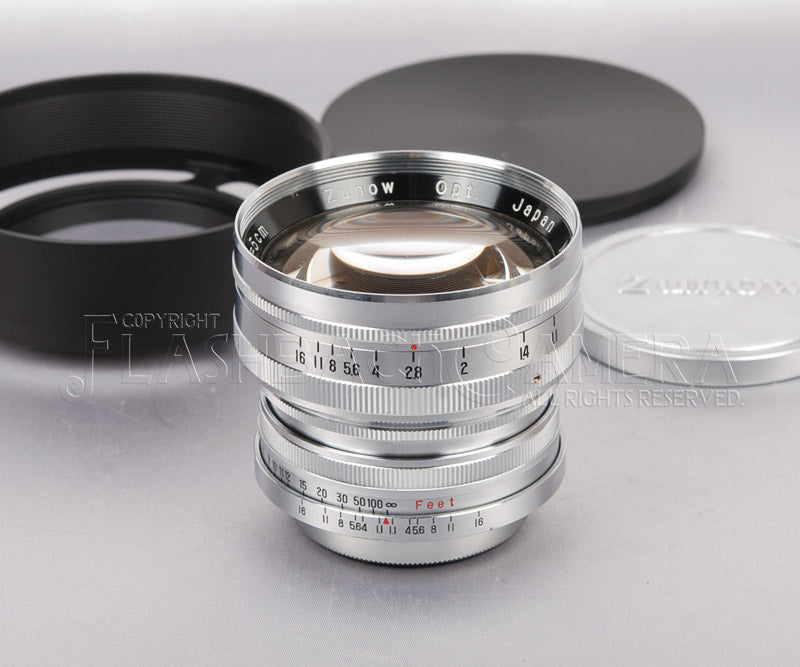後期型。4群9枚構成。Zunow Opt.銘。名前もカタチも、ロゴも描写も、そしてヒストリーもたまらなく魅力的な、ノン・ライツのニッポン代表。開放付近で豪快なフレアが出る初期のピンポンに比べ、新種ガラスの採用とレンズ構成の改良により、大幅に描写性能が向上。開放ではフレアが盛大に出ますが、少し絞り込むだけで解像力も高く、シャープな描写に変化します。ガラス綺麗です。2016年5月にOH済。社外品のフードが付属します。試写結果良好です!