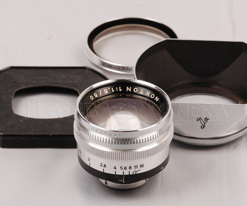Standard large diameter lens for rangefinder camera from Voigtlander, Prominent. Late version. No helicoid, yet it is useable on vairous cameras including digitals with using adapter built-in helicoid. The hood cap with big hole is for Dynaron 100mm.