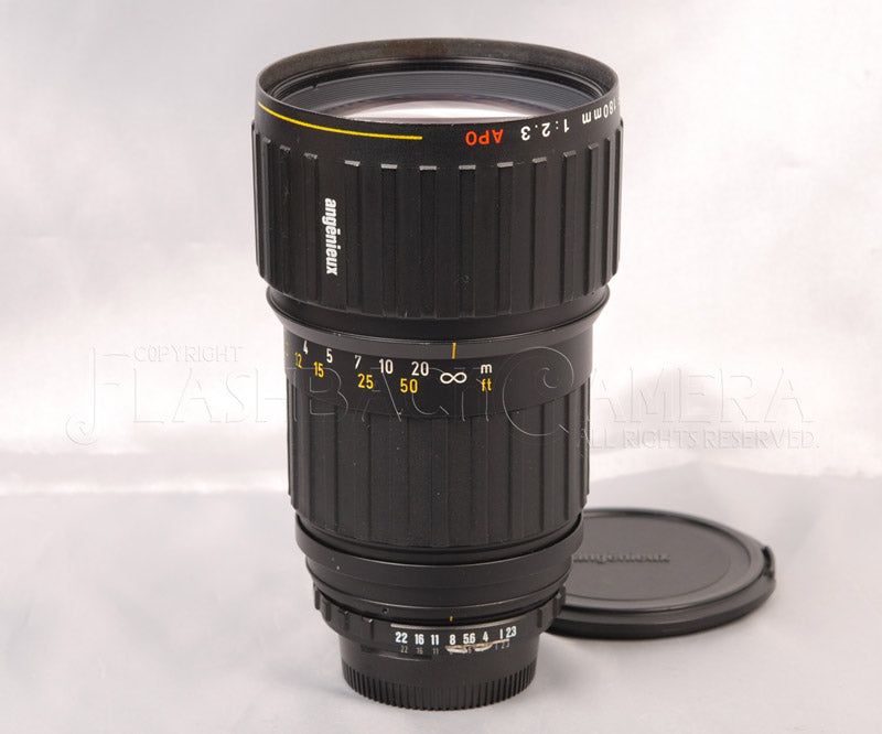 Made in 1989. 8 elements in 5 groups. Apochromat type. 995g. Large diameter telephoto lens from Angenieux. Built-in hood. For Nikon F cameras (Ai-s). *Selling on consignment.