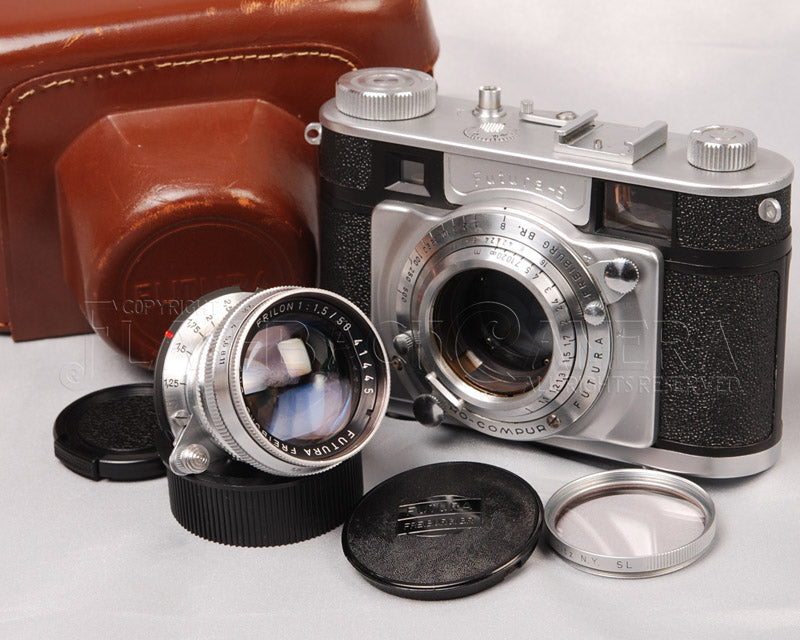 Manufactured by Futura Camera. Made in Germany, 1952-57. The top of the early Futura line. Its body with standard lens, Frilon 50mm f1.5, 6 elements in 4 groups. Very Rare.