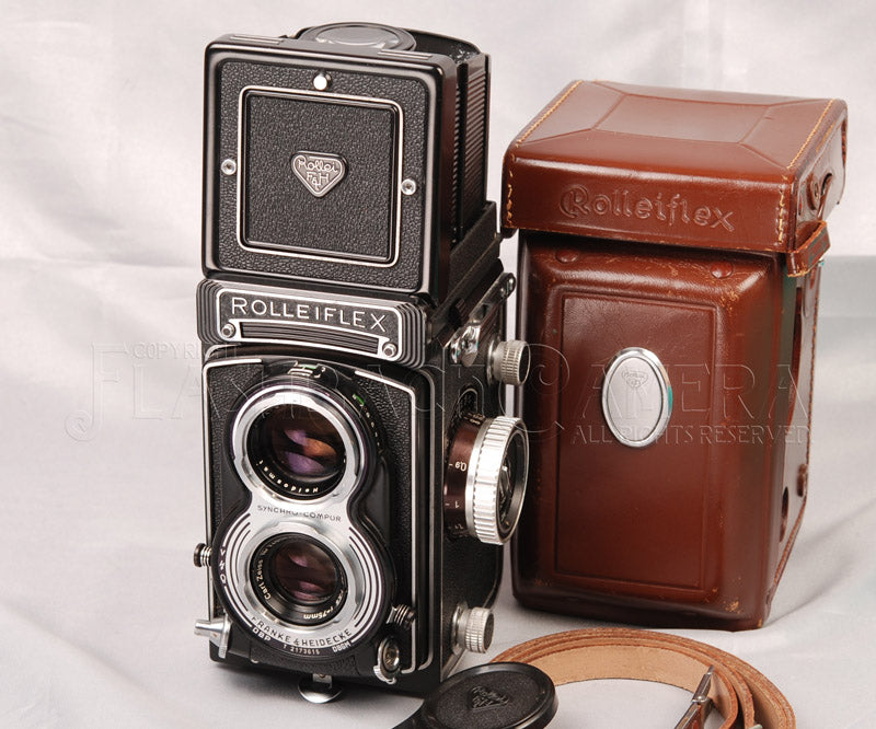 6x6 (120mm film). Crank type winding. Semi-Automat. Meter scale. Detachable pint hood. Entry model of Reolleiflex. Light and useful. Clean body. Good-conditioned finder screen. Slight cleaning marks and very faint stain found in element.