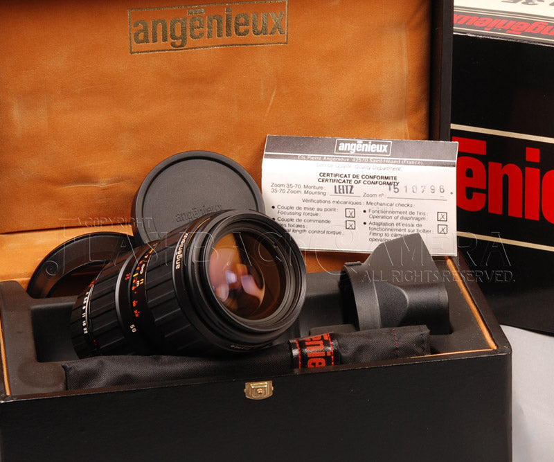 Type 2x35. Zoom lens for Leica R (3cam) from Angenieux, France. Manufactured in 1983-87. 8 elements in 11 groups. The closest distance is 0.46m. Full Set including original box and warranty with serial number matched with lens.
