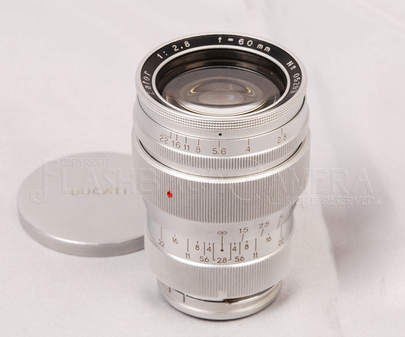 OD6403.1. Lator 60mm f2.8 for Ducati Sogno. Large diameter medium telephoto lens. Some plating peel is seen around mount part, yet the other parts ar very clean including the glass. Rings move smoothly. Well coupled with rangefinder and focusing good!