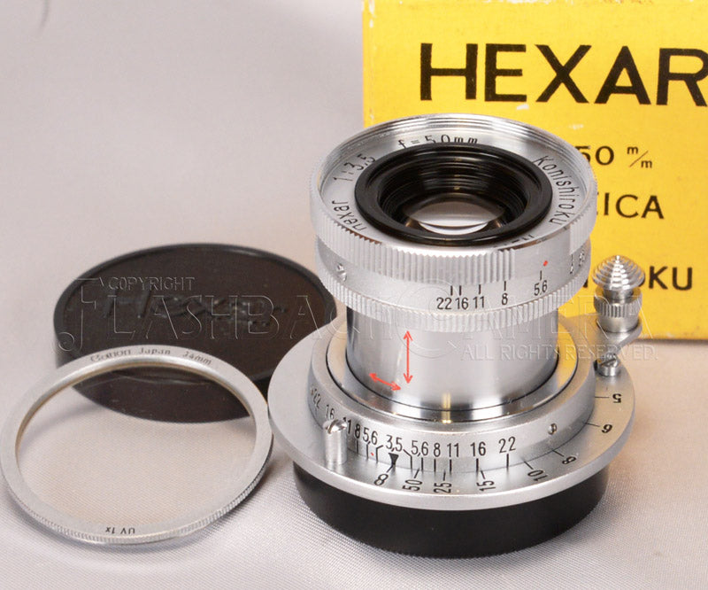 Manufactured by Konishiroku Kogyo. LTM. Debuted around 1955. Feet scale. For Japanese Leica Copies, Chiyoca, Chiyotax, Leotax, Honor, Nicca, Melcon etc. 4 elements in 3 groups. Tessar type. Good for collection.