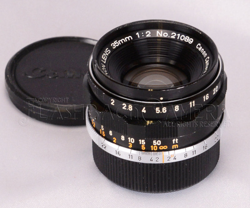 Wide angle lens manufactured by Canon. LTM. 7 elements in 4 groups. 1st generation model debuted in 1963. Designed by Jiro Mukai, famous for 50mm f0.95 and 35mm f1.5 & f1.8 Light and compact.