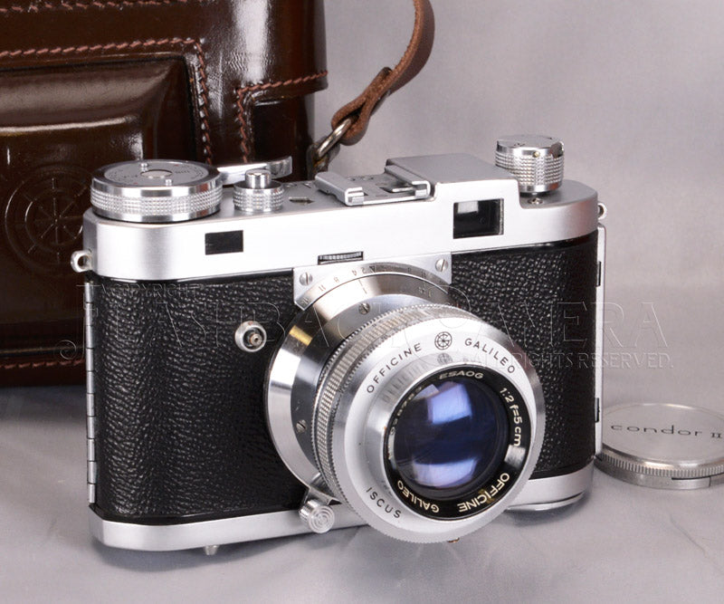 Rangefinder camera from Ferrania, Italy. High-end model of Condor I. With 50mm f2 lens from Officine Galileo. Manufactured around 1952. Comes with genuine lens cap and case. *The strap is not genuine.