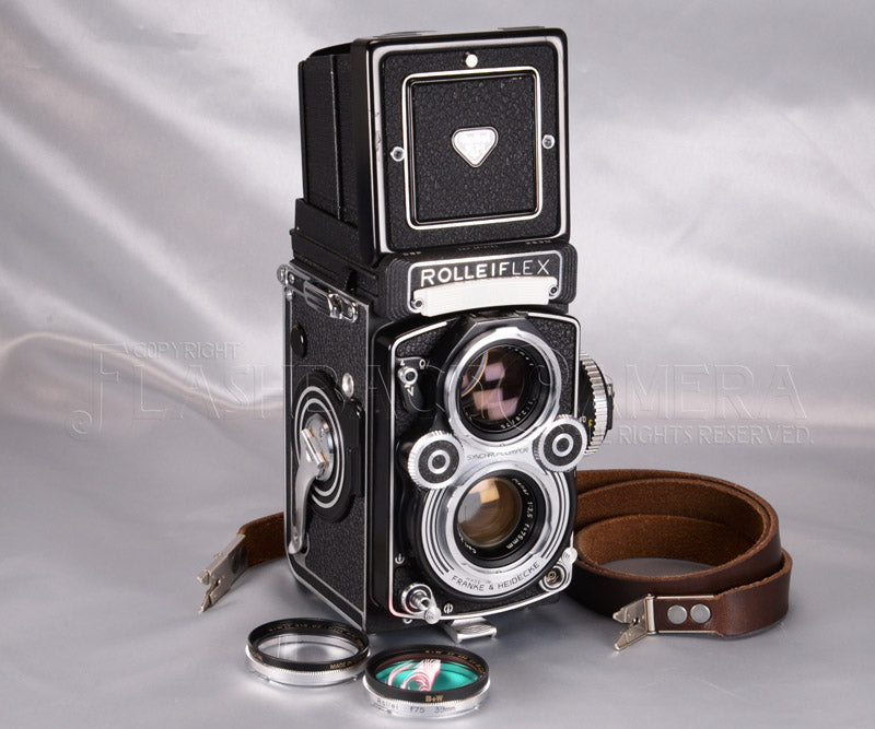 Rolleiflex with Planar 75mm f3.5. Manufatcured from 1965 to 1976. With exposure meter. Faint signs of use. Very clean body and lens.