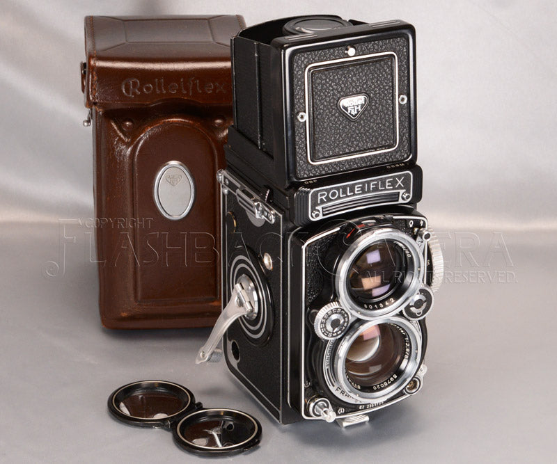 Rollieflex 2.8E2 manufactured between August 1959 to June 1960. With Xenotar 80mm f2.8. No exposure meter. Deatchable pint hood and finder screen.
