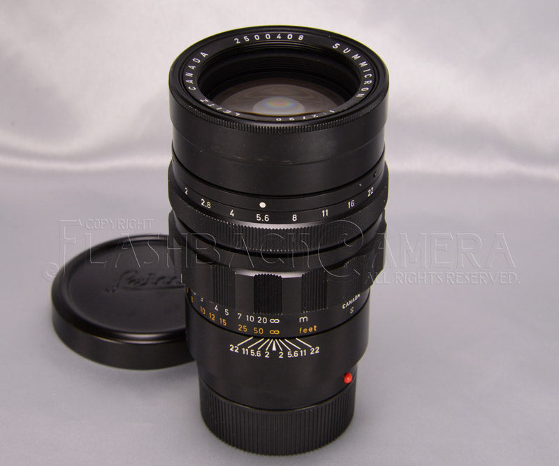 Manufactured in 1971 by Leitz Canada. 2nd gerenation of Summicron 90mm f2. Black chrome. Built-in hood. Usable with Visoflex and ZOOEP helicoid. Comes with genuine front cap.