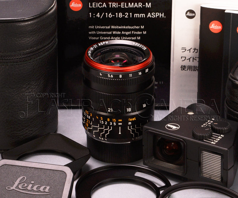 11642. Tri-Elmar 16-18-21mm f4 ASPH. With universal wide angle finder. 6 bit code. Very compact design. Closest distance is 0.5m without rangefinder coupling. 0.7m to infinity, coupling with rangefinder.