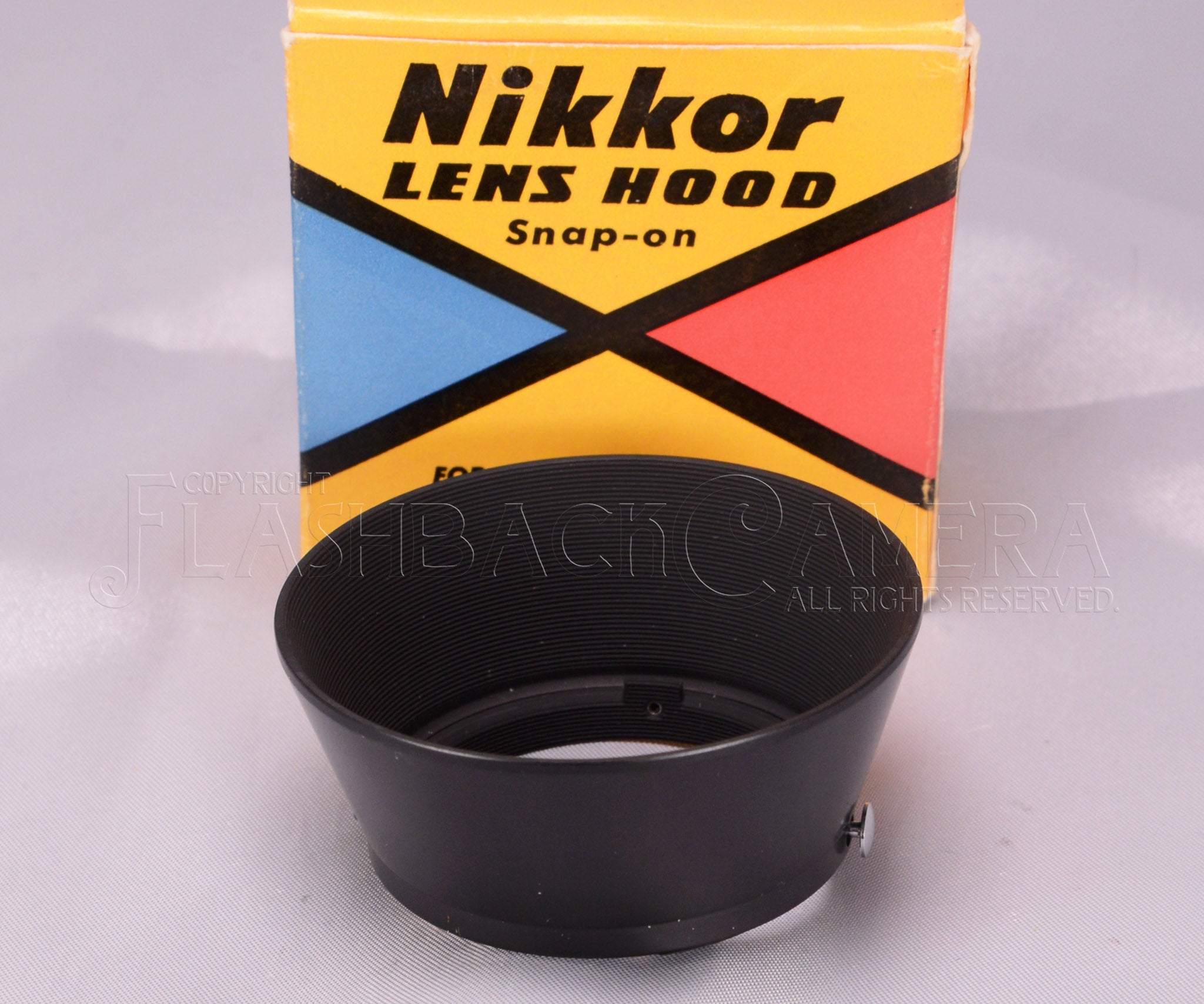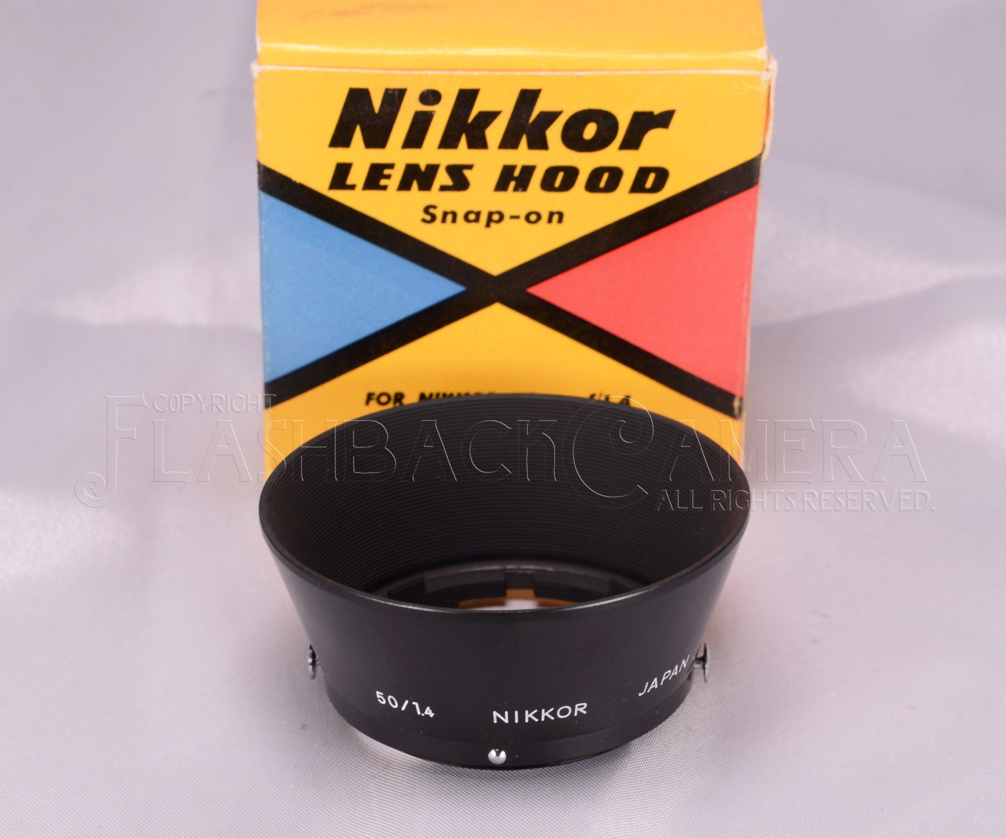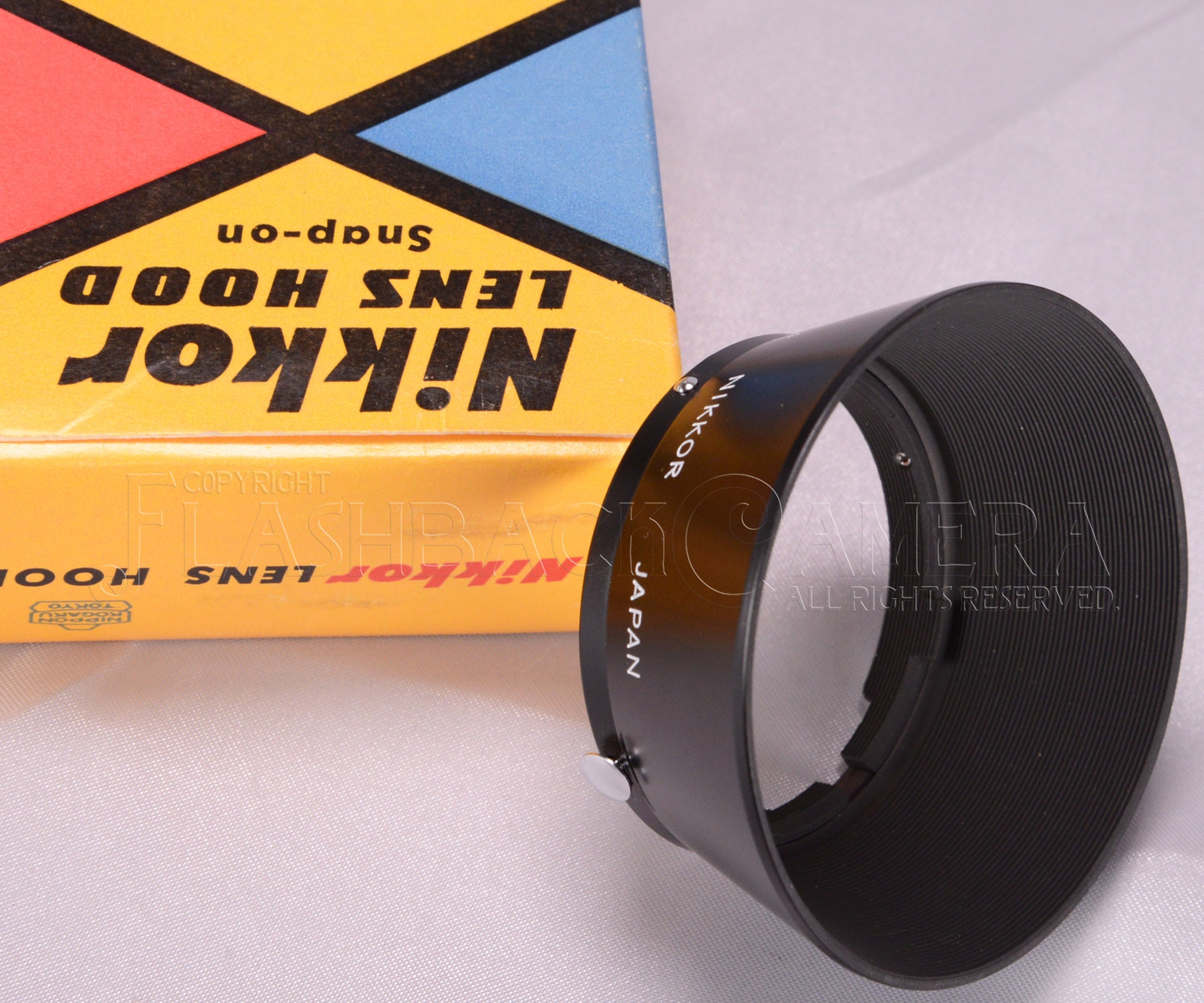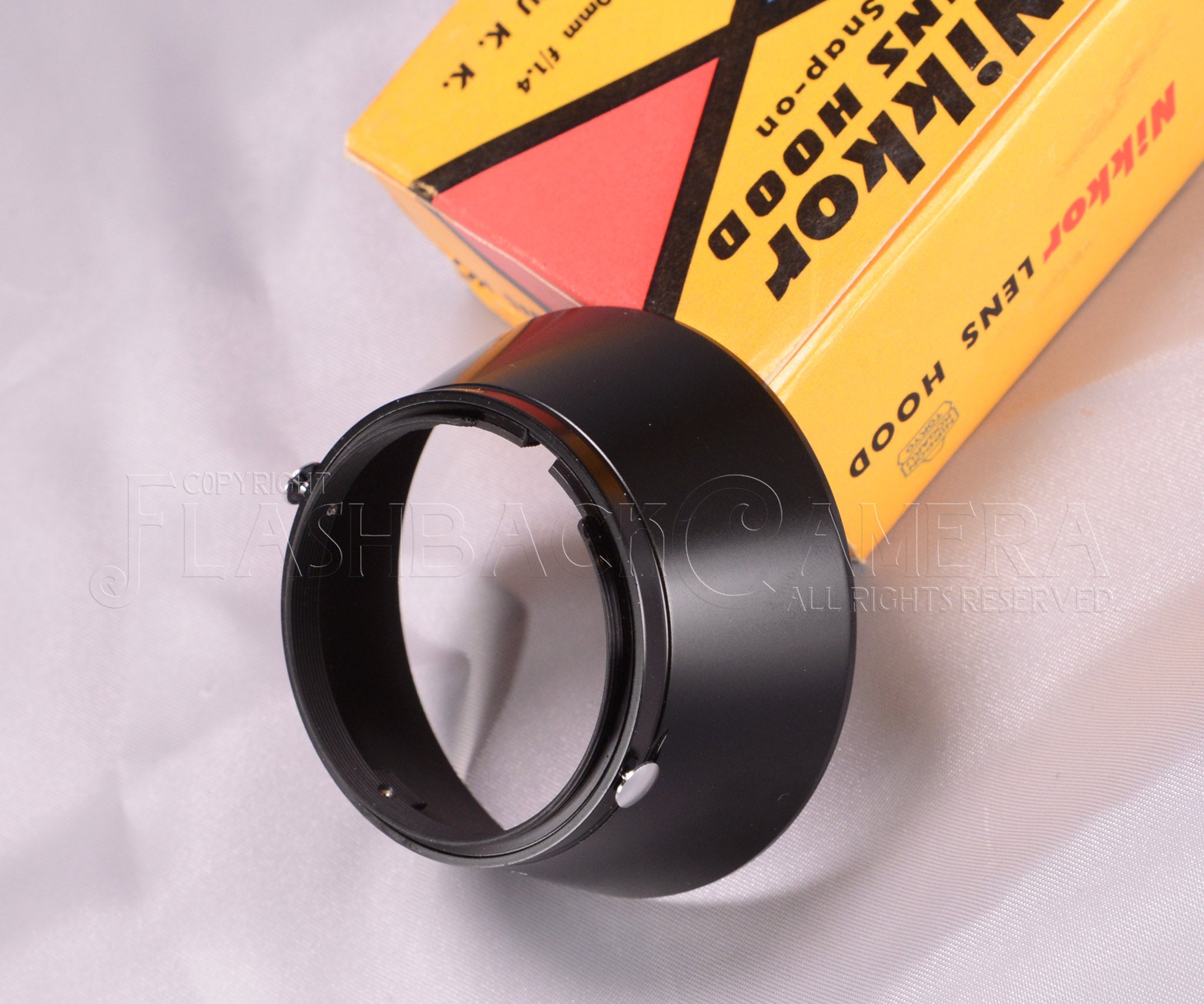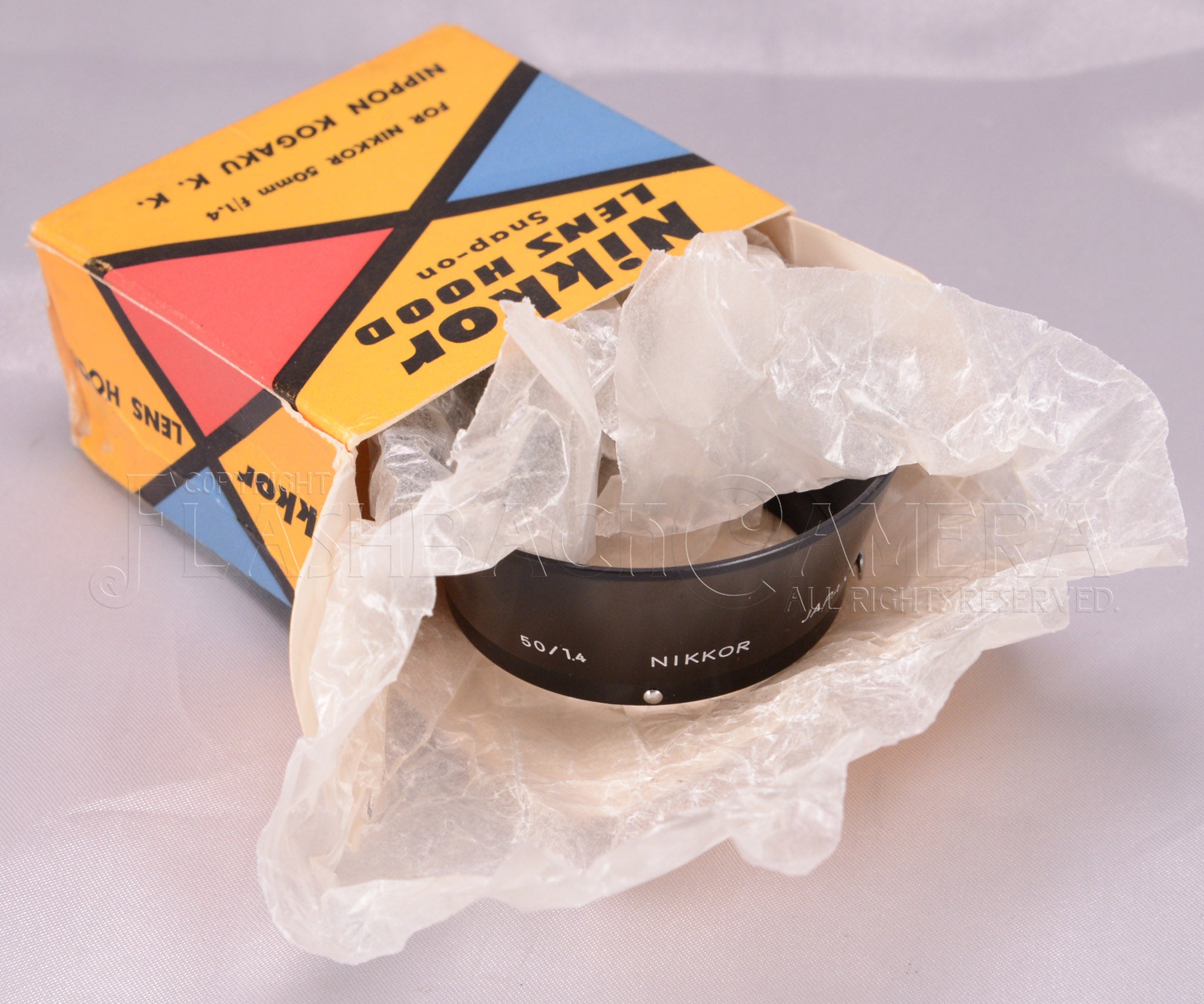 Lens hood for Nikon S-series, Nippon Kogaku's Nikkor 50mm f1.4. It bears the simple inscription "NIKKOR." Comes with the colorful original box and packaging materials typical of that time. In brand-new condition, as if transported to the present day by a time machine. Deadstock item.