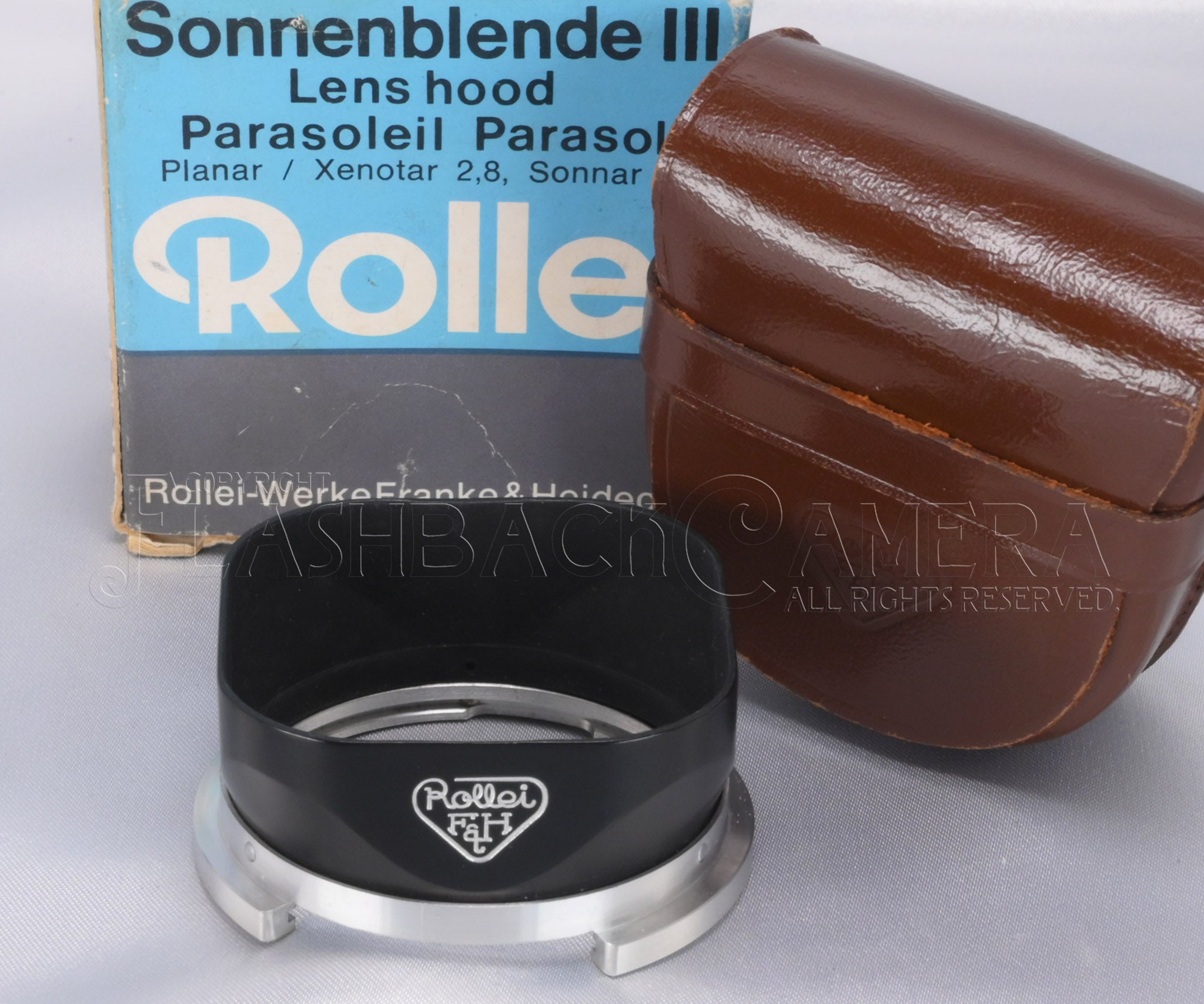 Lens hood for the Rolleiflex 2.8F and other RIII bayonet mount lenses. Suitable for Planar and Xenotar 80mm lenses. Features an old logo stamp and a classic look. It is in near-new condition!