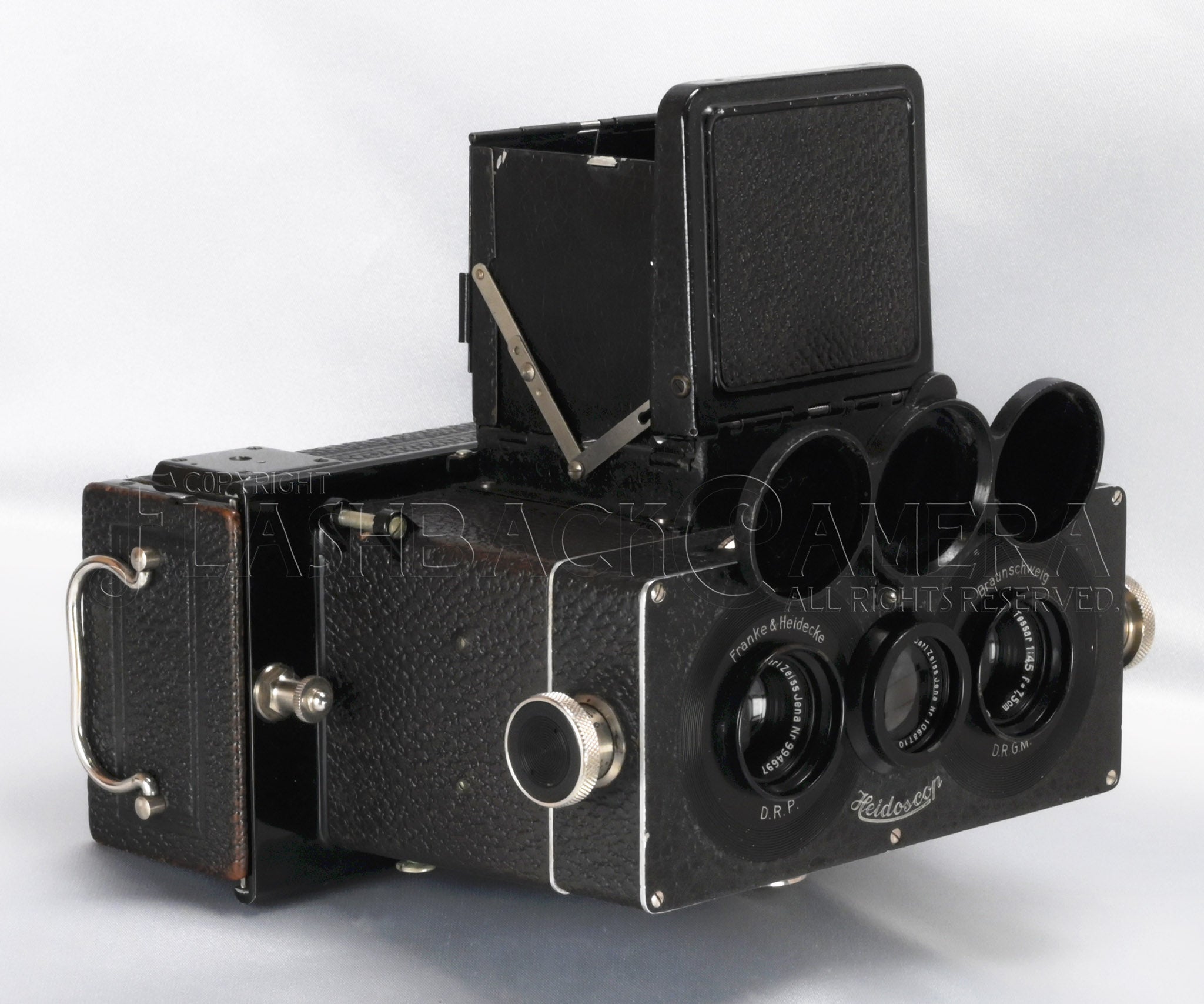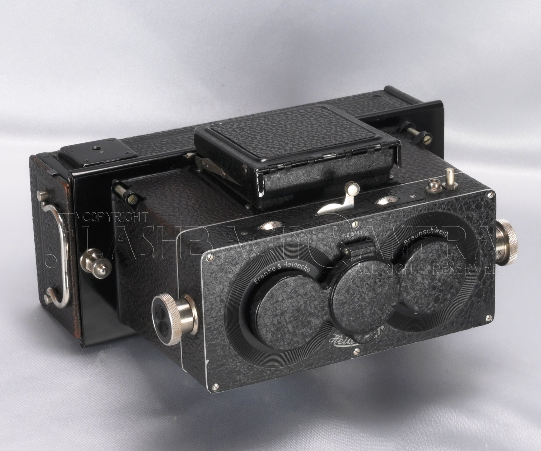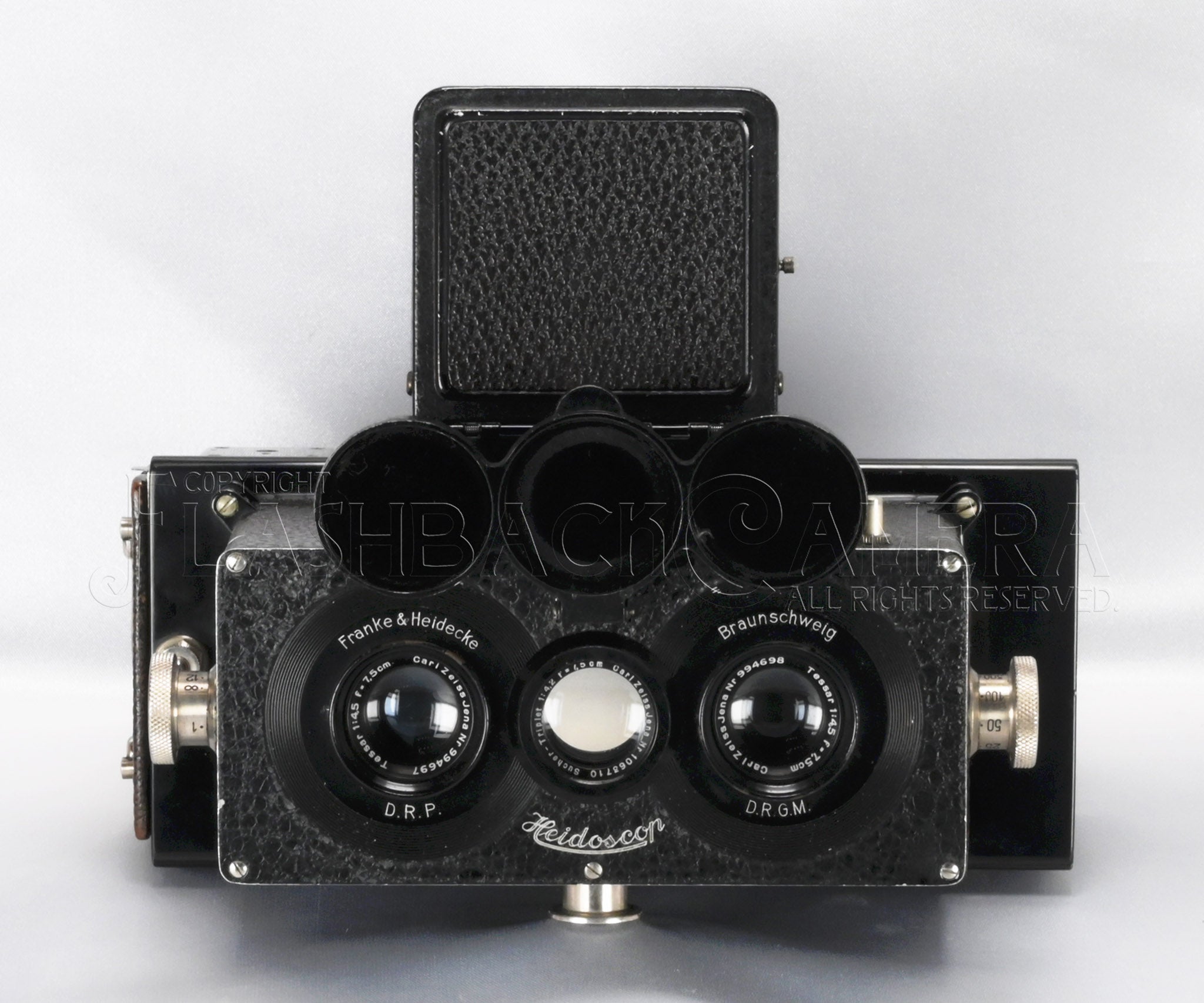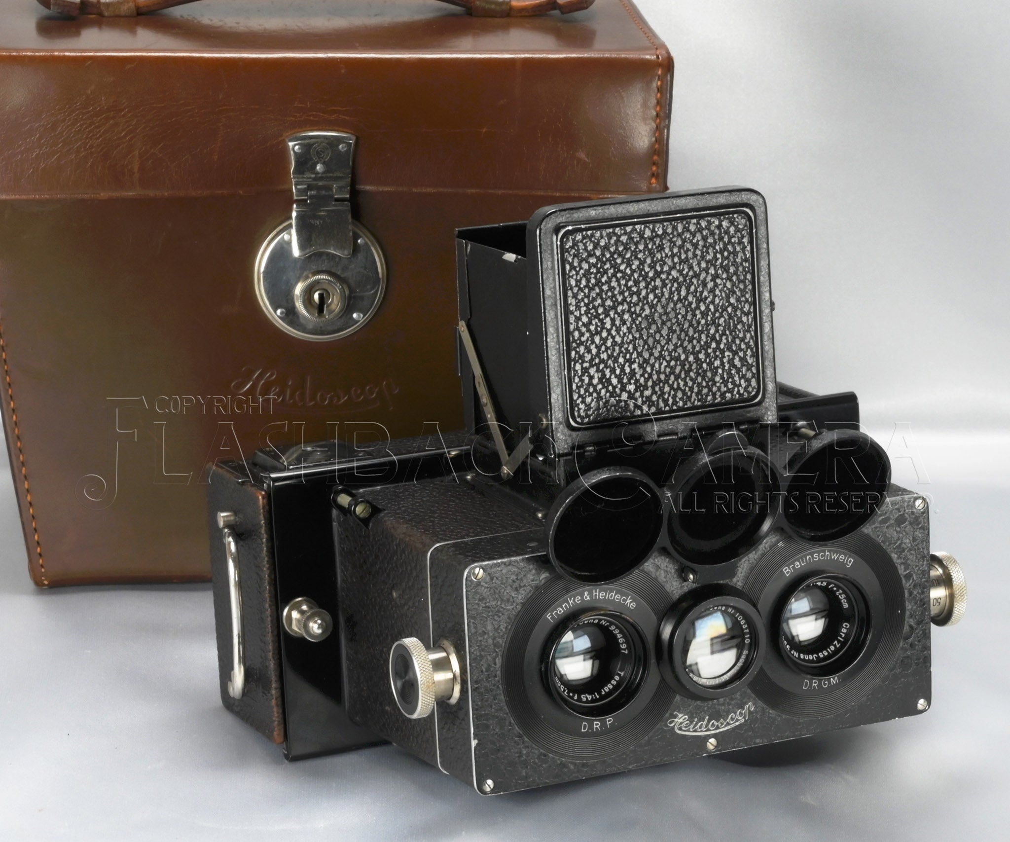 Manufactured by the German company Franke & Heidecke, the Heidoscop is a stereo twin-lens reflex camera produced between 1925 and 1940. It was introduced as an advanced model equipped with a Carl Zeiss Jena Tessar 75mm f4.5 lens. It can be considered an ancestor of the Rolleiflex.