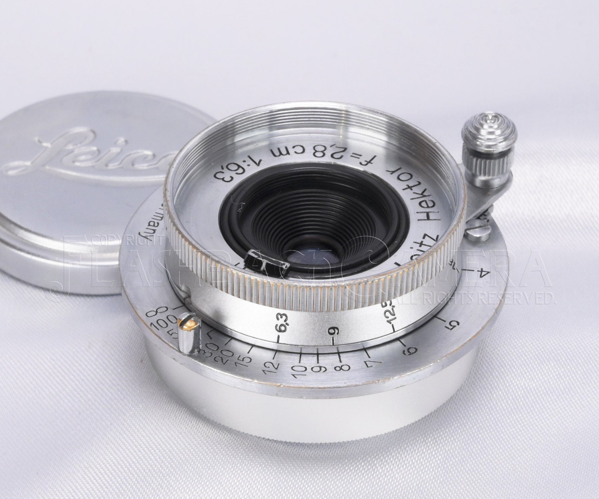 Pre-war Hektor 2.8cm f6.3, HOOPYCHROM, manufactured in 1939, with a chrome finish. The distance scale is in feet, and the aperture follows the continental system. This lens features a faint blue coating, likely applied by Leitz in the early post-war period.