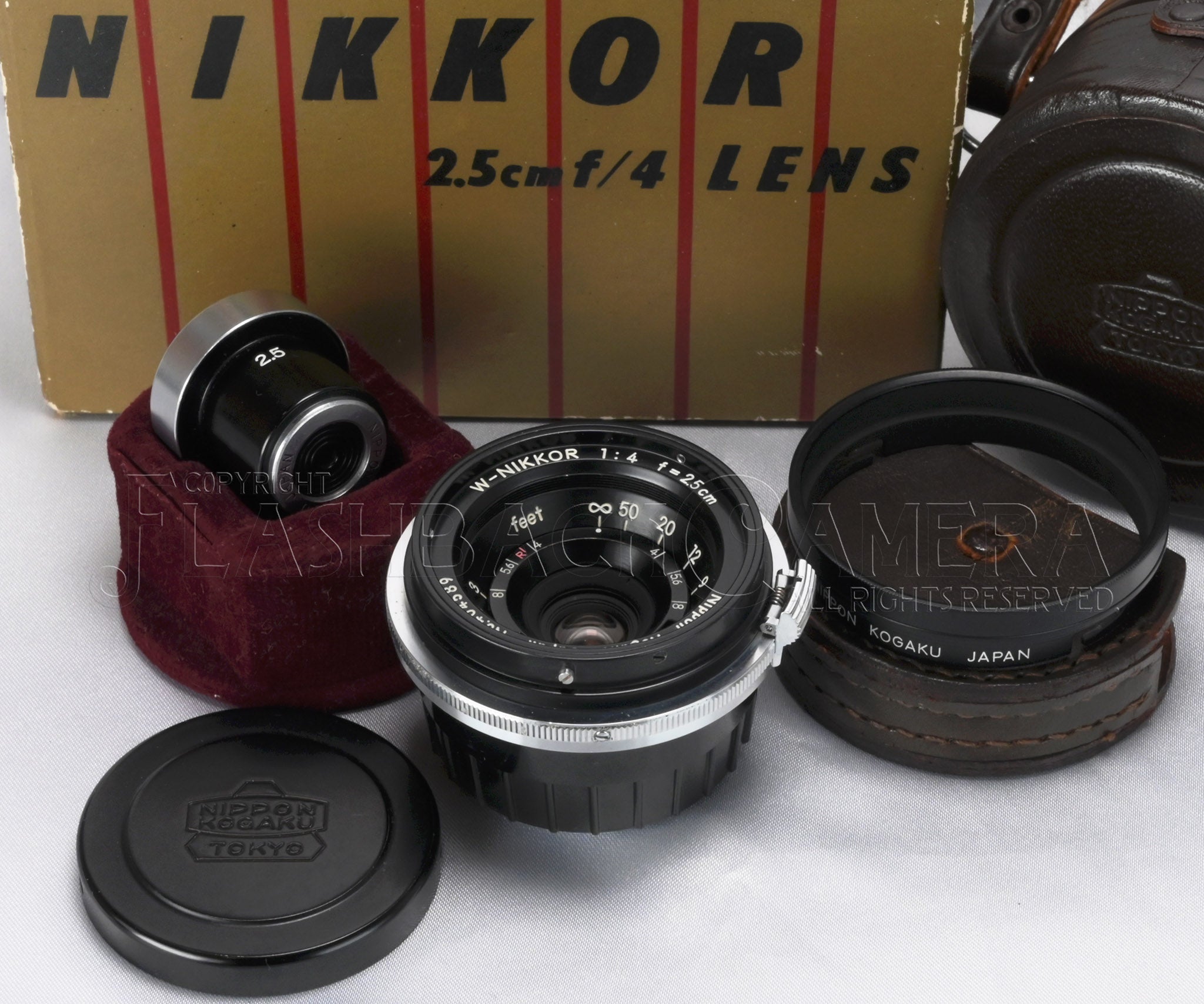 This is the later version of the W-Nikkor 25mm f/4, a wide-angle lens made by Nippon Kogaku for the Nikon S-series rangefinder cameras. Introduced in 1953 following the Contax-mount Topogon 25mm f/4, it held the title of the widest-angle lens available for 35mm format cameras at the time of its release.