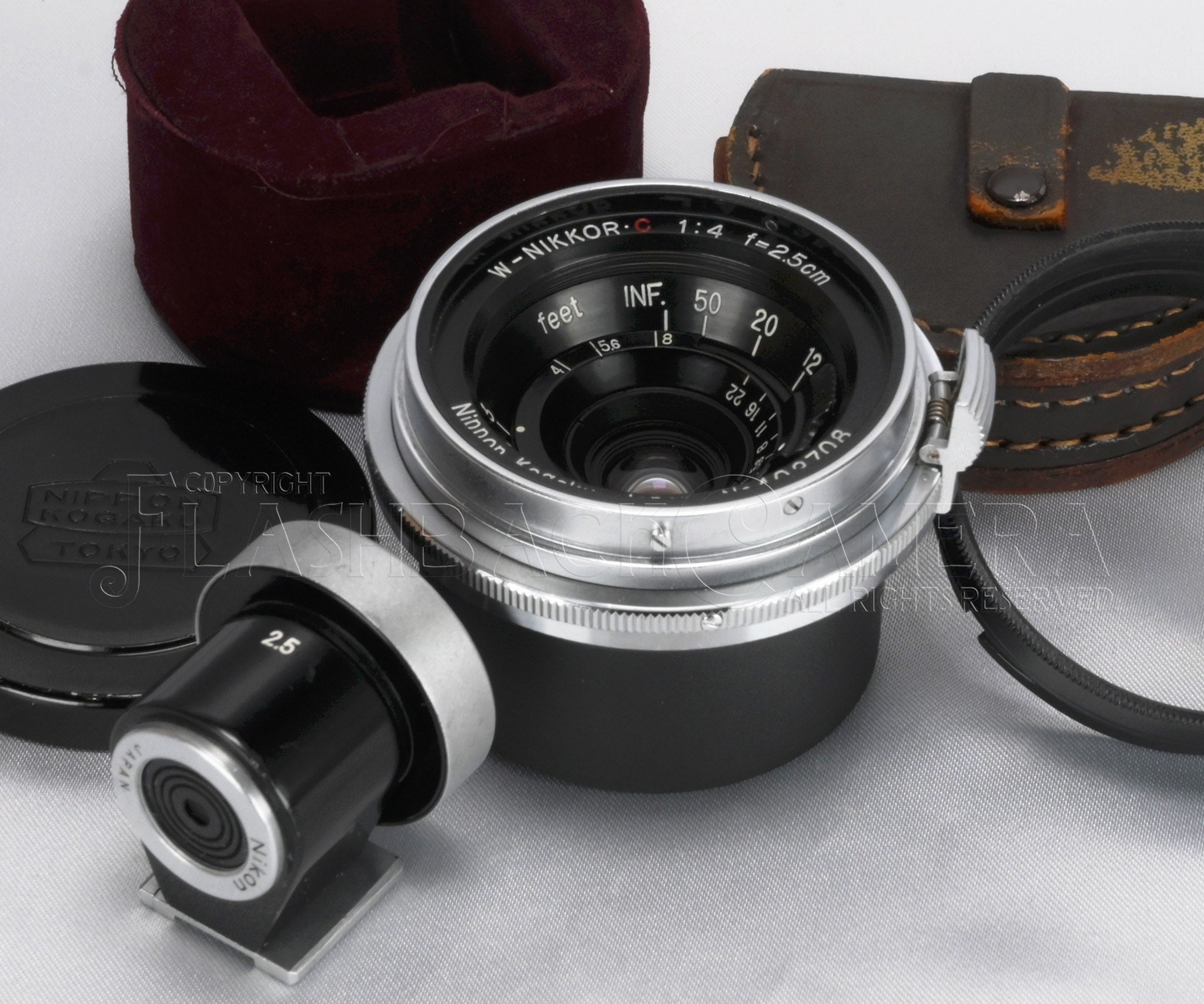 W-Nikkor-C 25mm f/4, Early Type – For Nikon S Released following the Contax-mount Topogon 25mm f/4, this lens debuted in 1953 and, at the time, boasted the world's widest angle of view for a 35mm format camera.