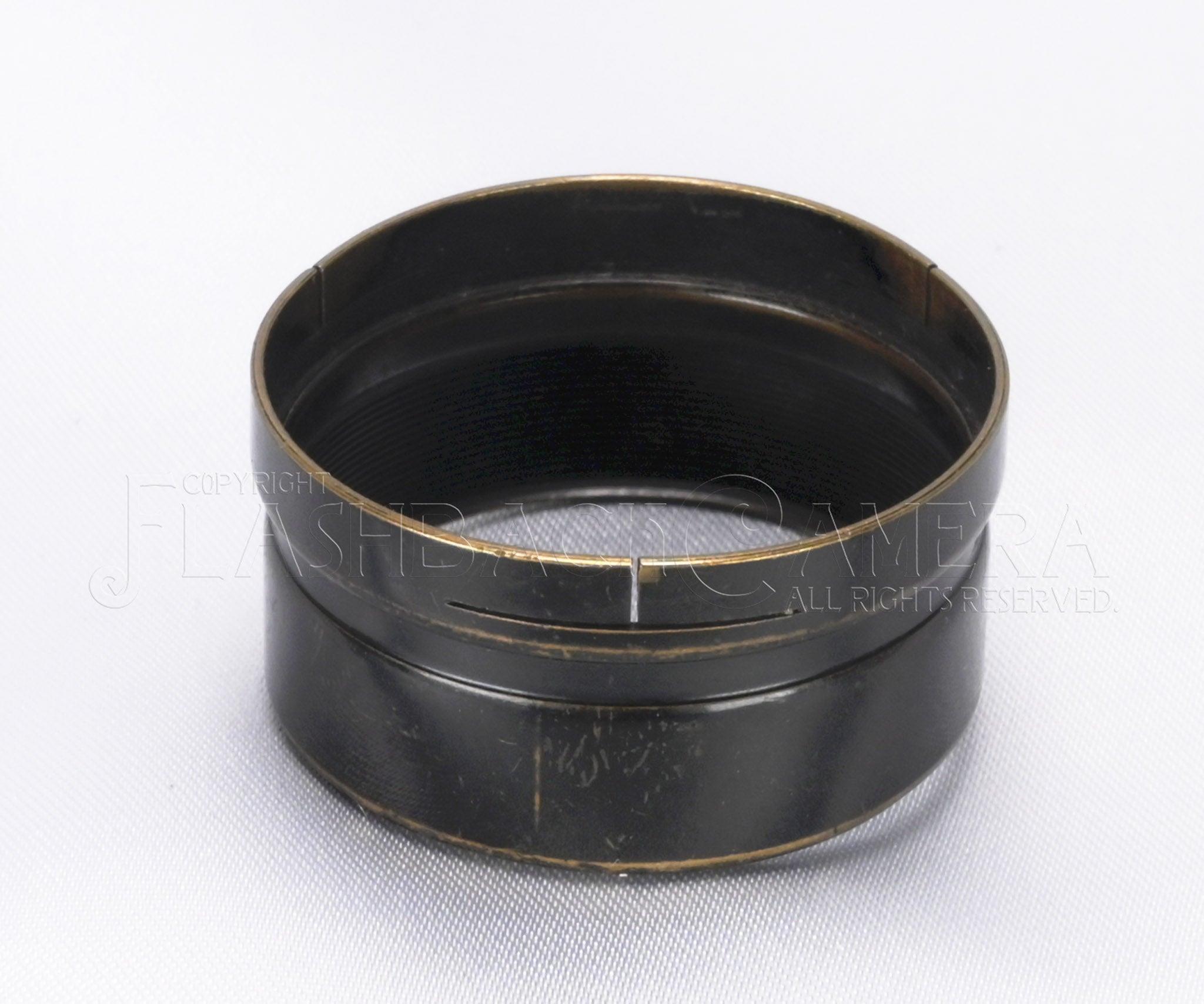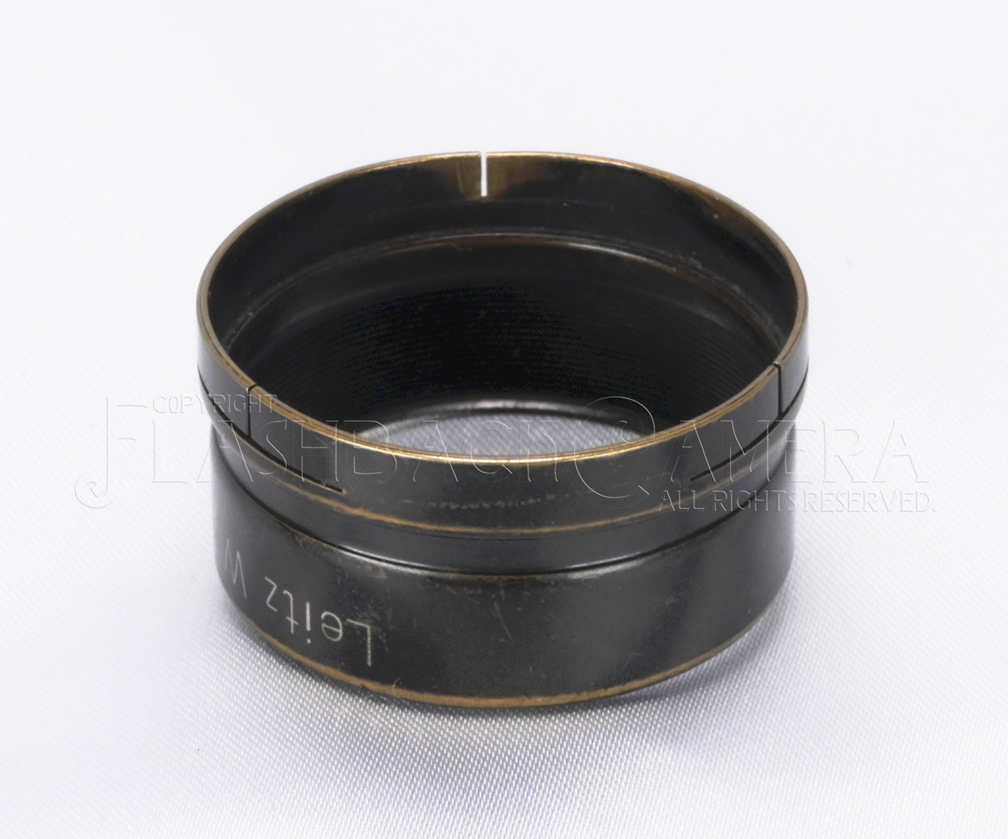 A lens hood for the Elmar 50mm from the Leica Model A era, known as FISON. Made of brass with a black paint finish. This is an early version without the retaining screw, featuring a one-piece construction with reinforcing ribs on the sides for added strength. It has the silver inlay Leitz Wetzlar inscription.