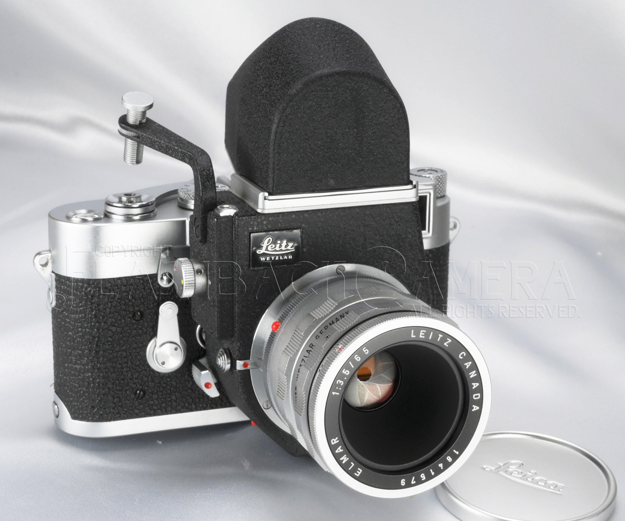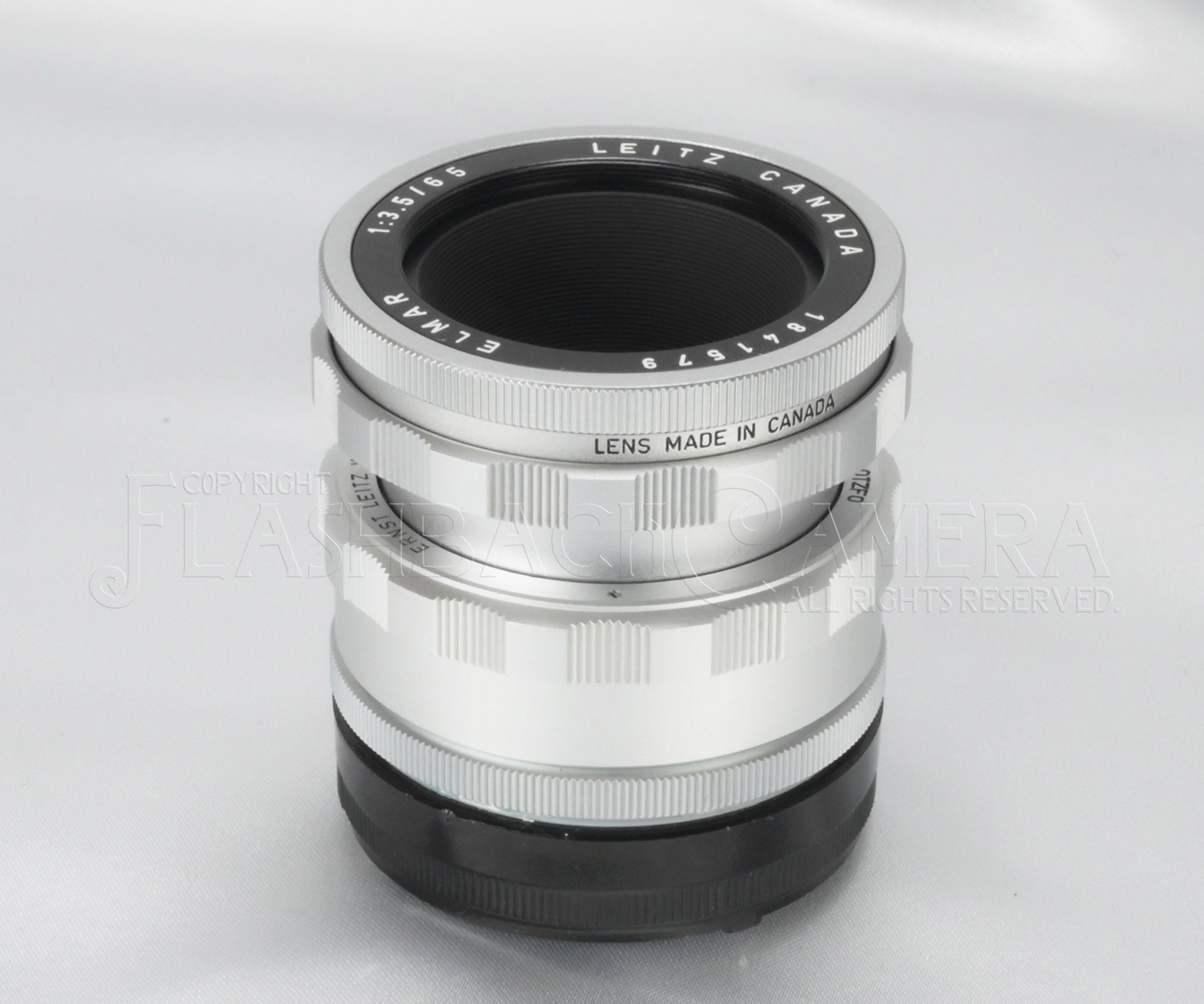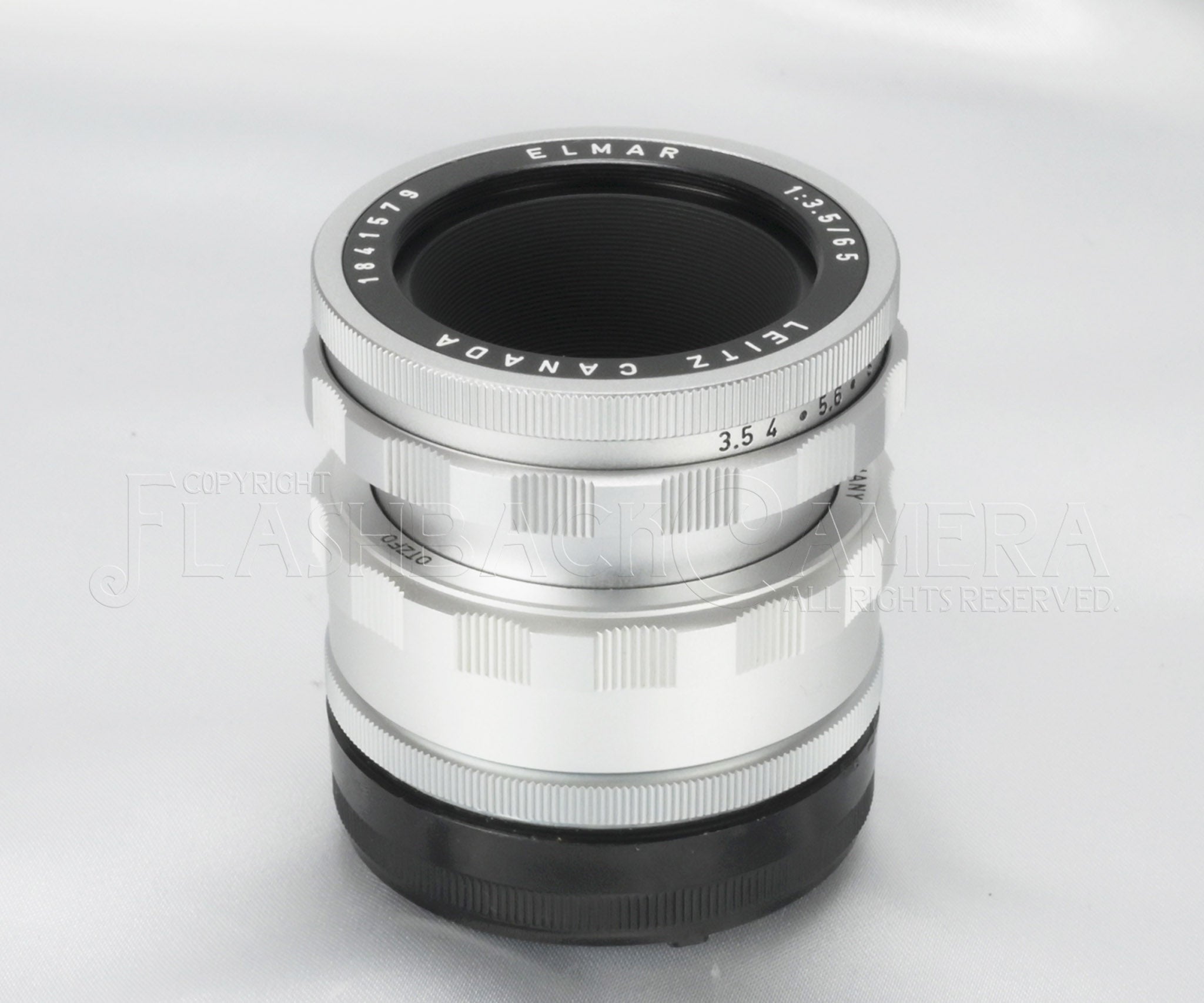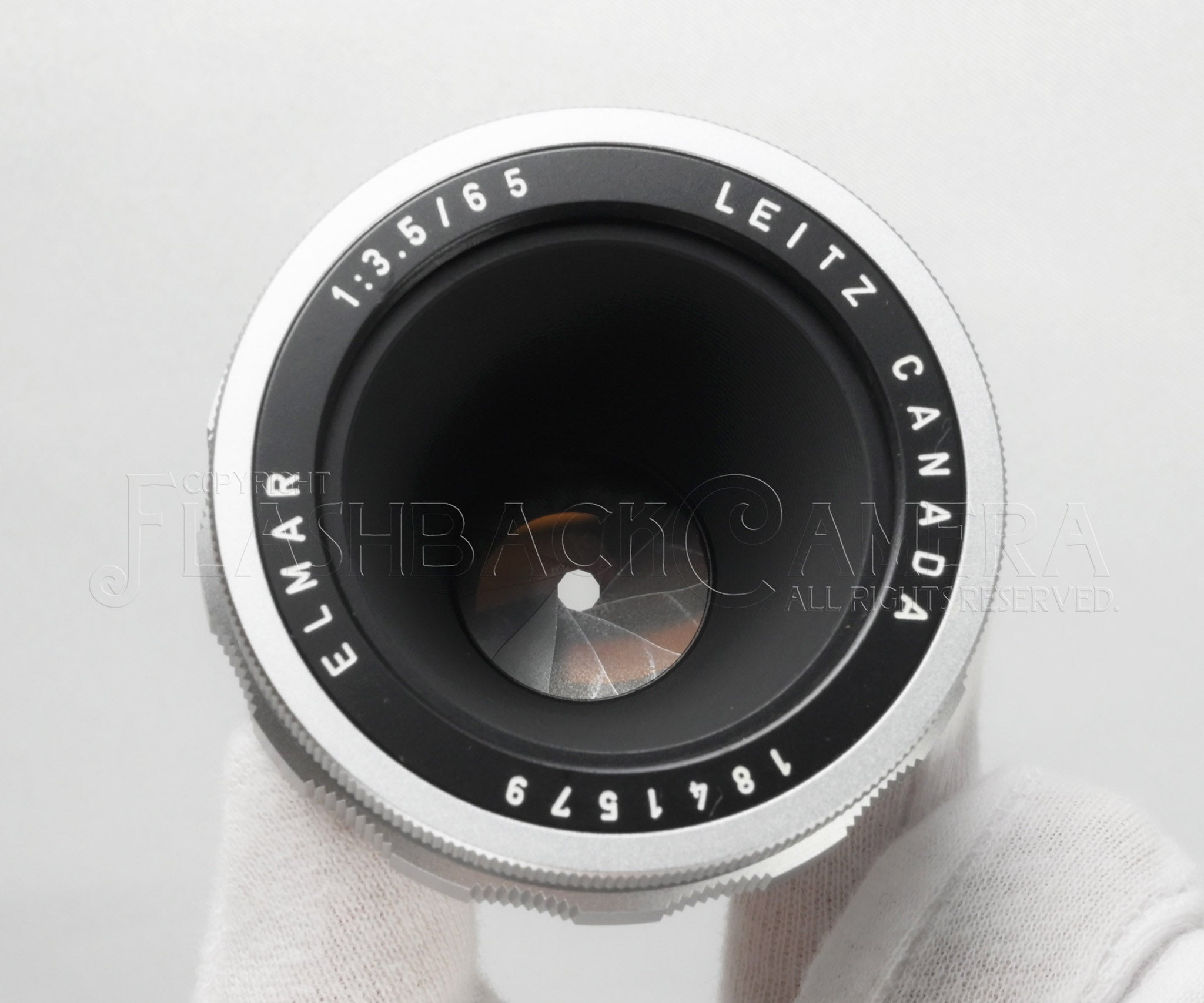 Elmar 65mm for Visoflex with OTZFO helicoid (16464K). Serial number in the 1.84 million range, manufactured in 1961 by Leitz Canada. This is the earlier chrome version, compatible with E41 filters. Mounted via Visoflex II or III on an M-series Leica, it allows shooting from approximately 15 cm from the front of the lens to infinity. Highly regarded for its close-up performance, this lens has earned an excellent reputation among both our staff and customers. The recessed front element makes a hood unnecessary, which is another welcome point. Its superb build quality also reflects the golden era of Leitz production.