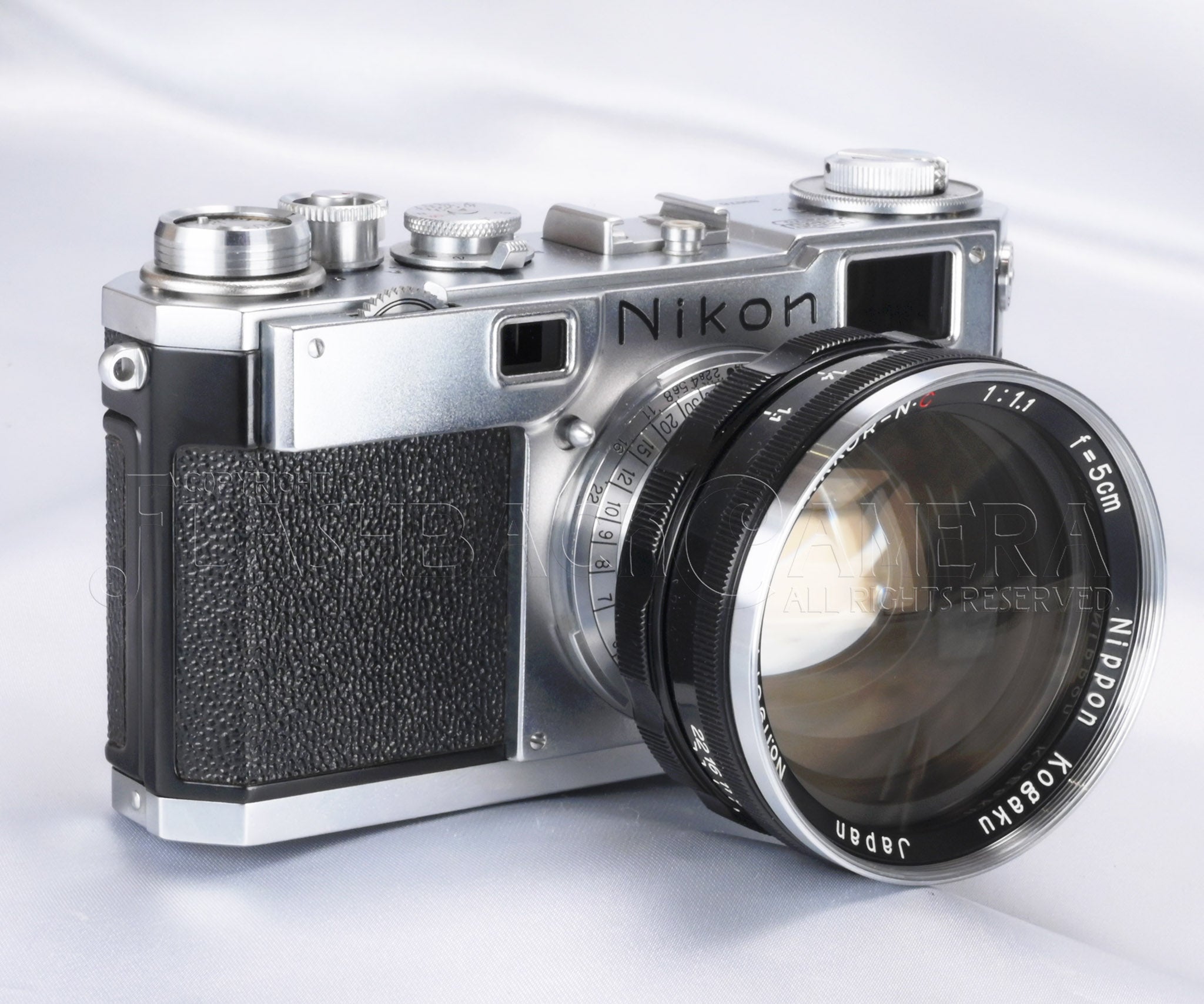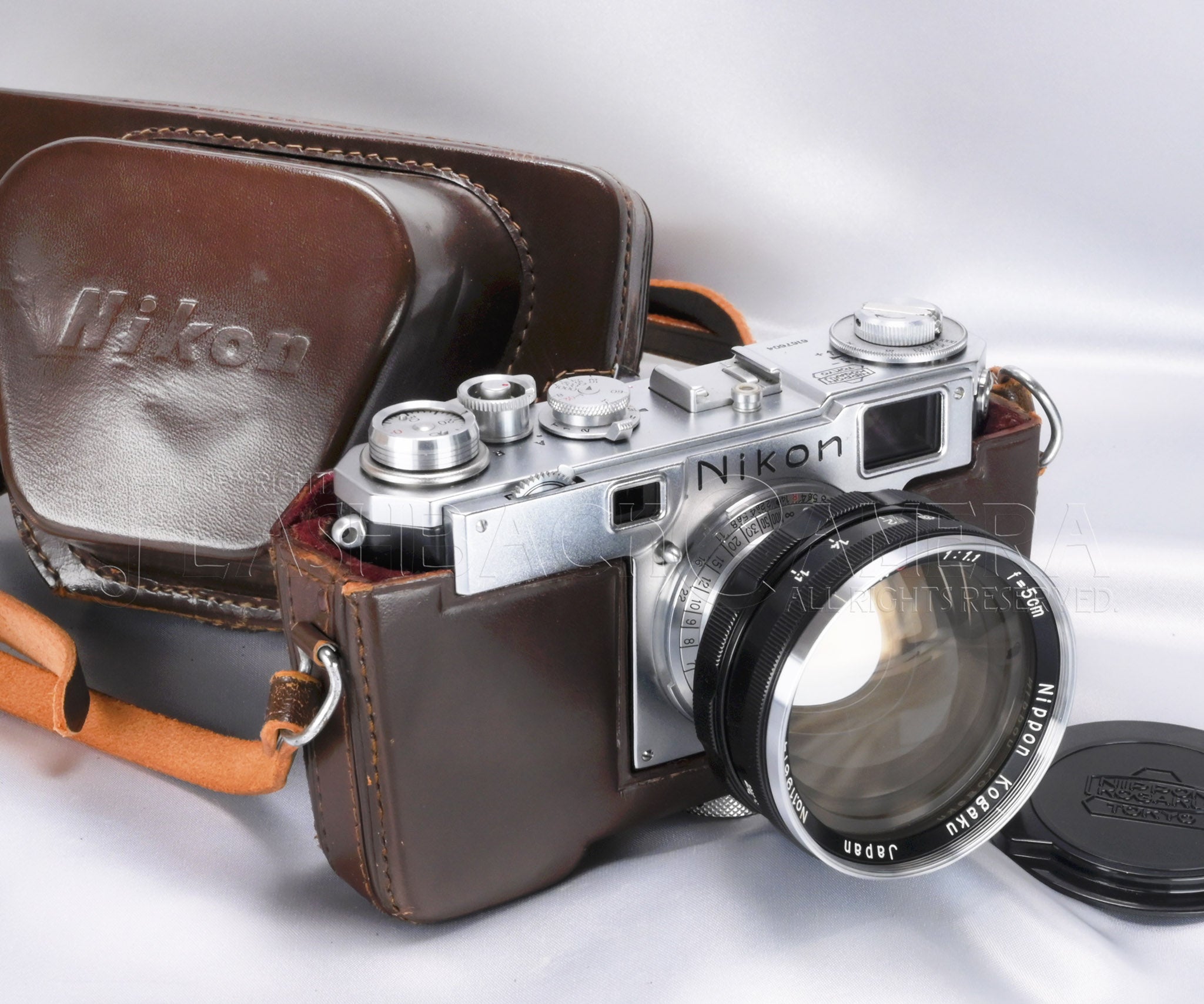 Nikon S2 body with Nikkor 5cm f1.1 internal bayonet lens, dedicated caps, and leather case.