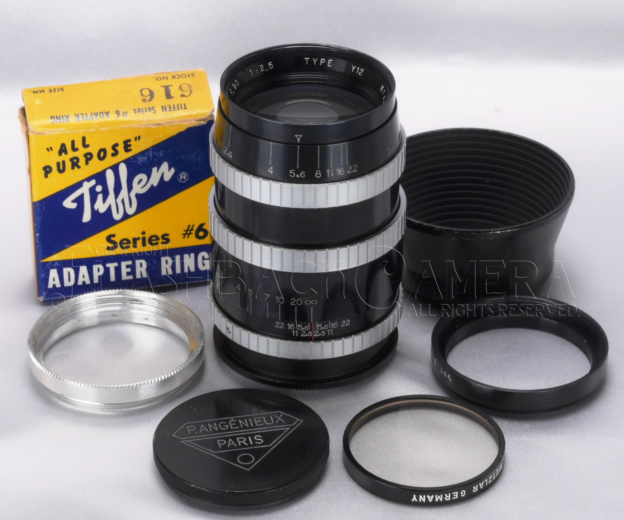 Angenieux 90mm f2.5 late type, Type Y12. Manufactured in 1960. M42 mount. 4 elements in 4 groups. Meter scale. Based on the presence of a retaining screw hole in the threaded section of the mount, it is believed that this lens was originally for Rectaflex, which, when the adapter ring is removed, converts to M42 mount.