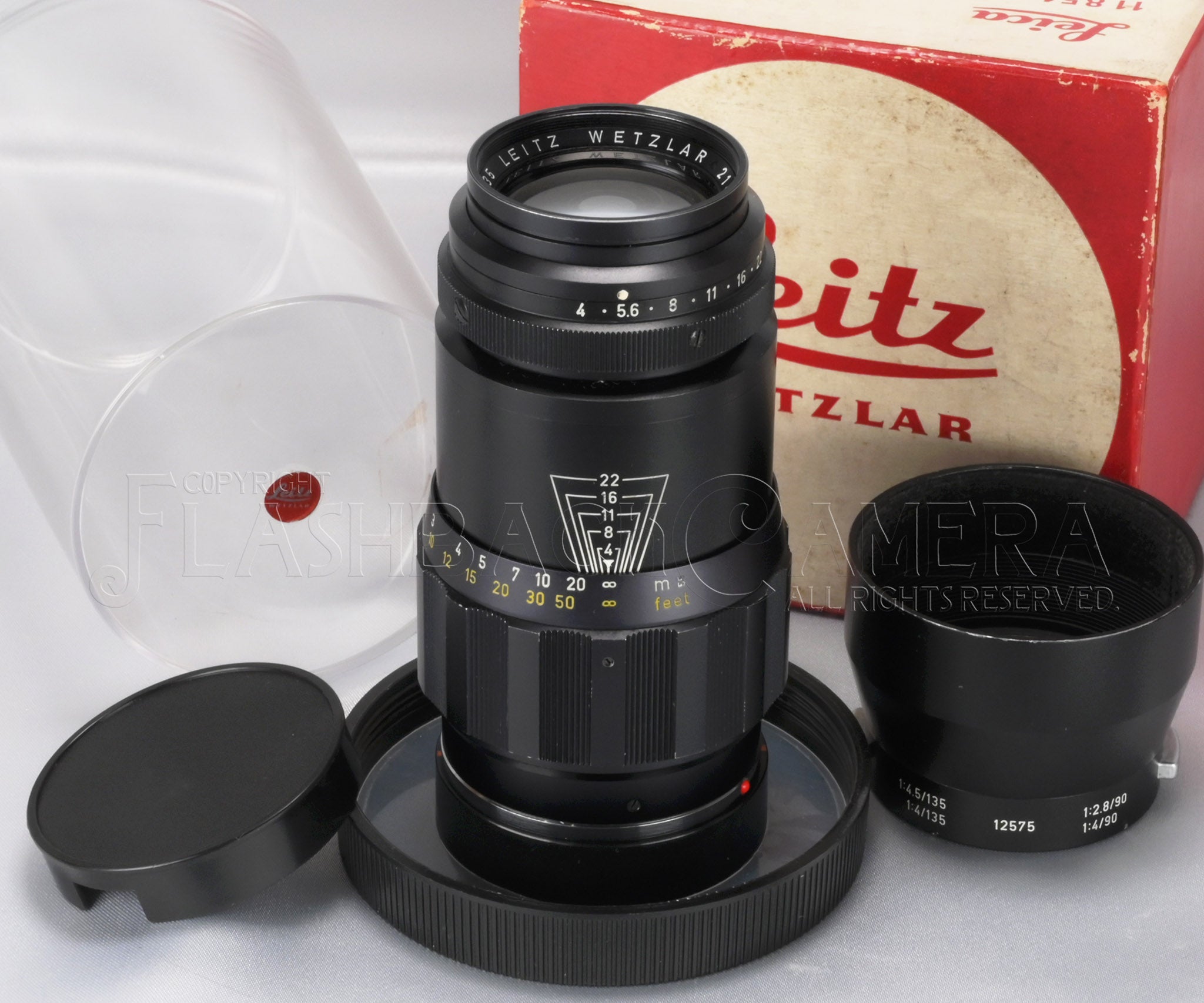 There are some signs of use such as scuff marks on the helicoid ring and slight fading on the distance scale, but overall it has a rather clean appearance. There is a slight play in the helicoid ring, though it does not affect focusing or rangefinder coupling. Other functions, including the aperture ring, operate smoothly. Many Leica telephoto lenses often have unreliable rangefinder coupling, but this example maintains perfect accuracy from the closest focusing distance to infinity, even at full aperture. The lens glass is clear with no haze or cleaning marks, offering excellent transparency. Test shots also produced very good results. It comes with an all-black 12575 hood, a plastic case, and the original box, although the serial numbers do not match.