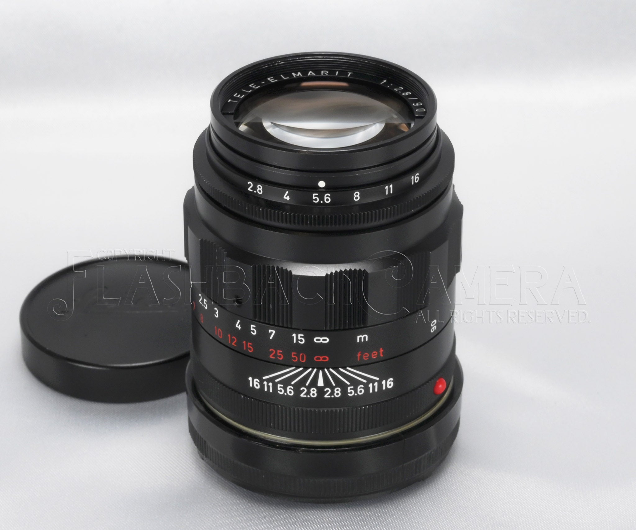 Tele-Elmarit 90mm f2.8, black chrome finish. Made by Leitz Canada. This is an early version of the black barrel model, featuring the bold and distinctive red scale. Leitz catalog number is 11800. Serial number in the 2.14 million range, manufactured in 1965.