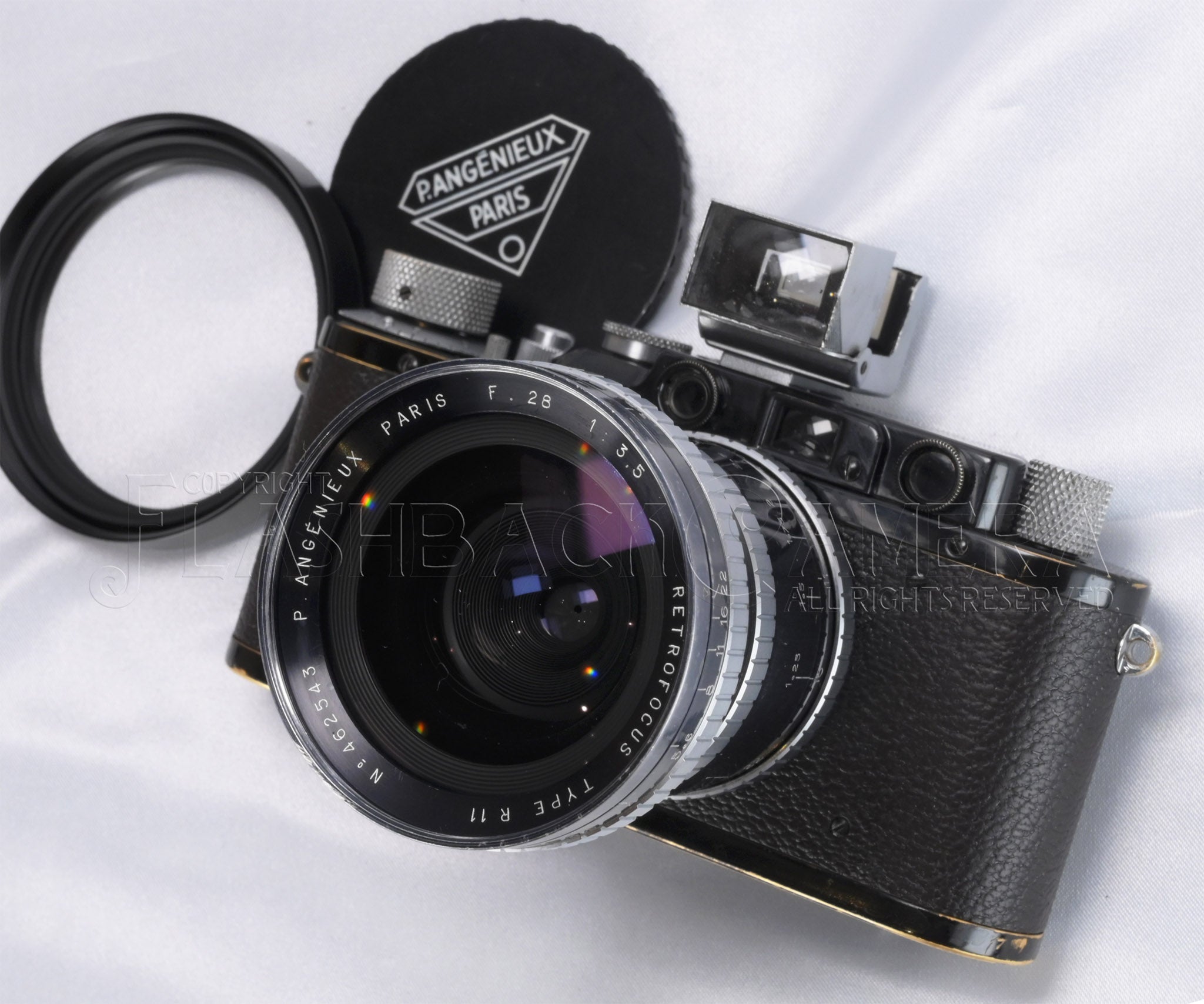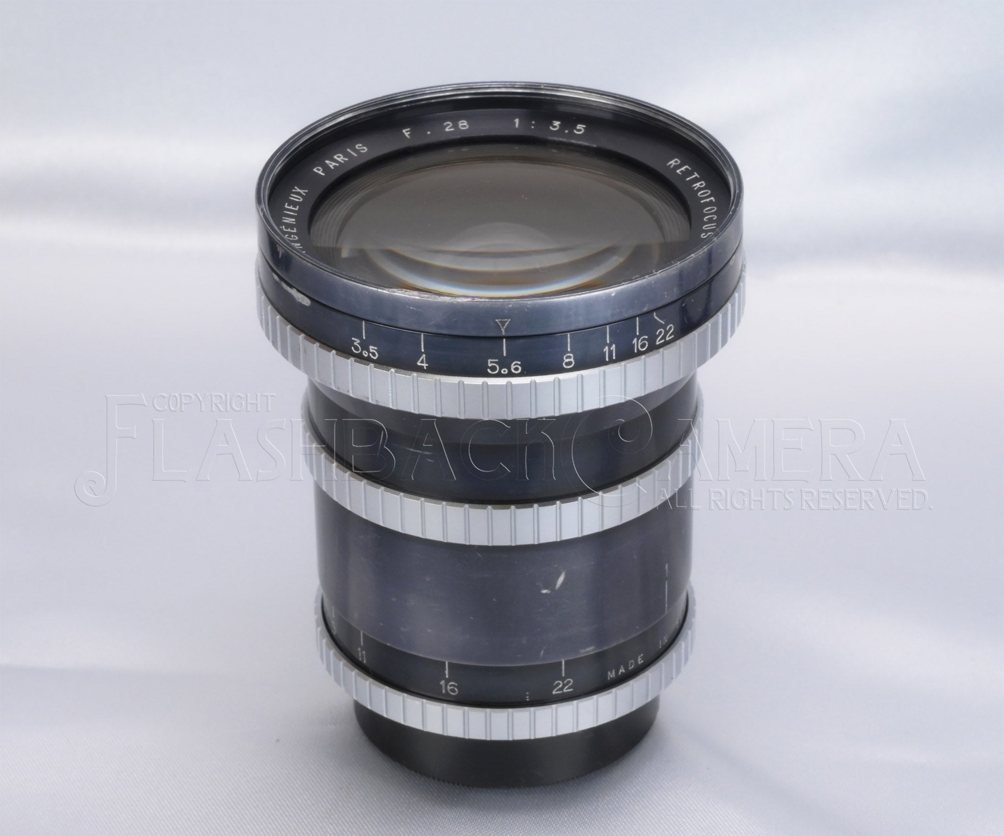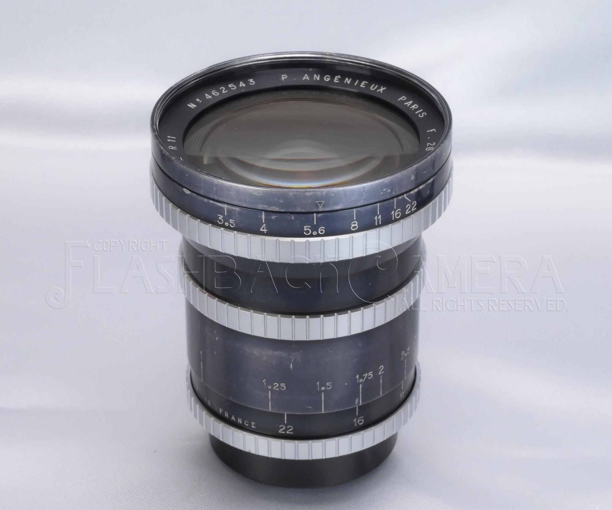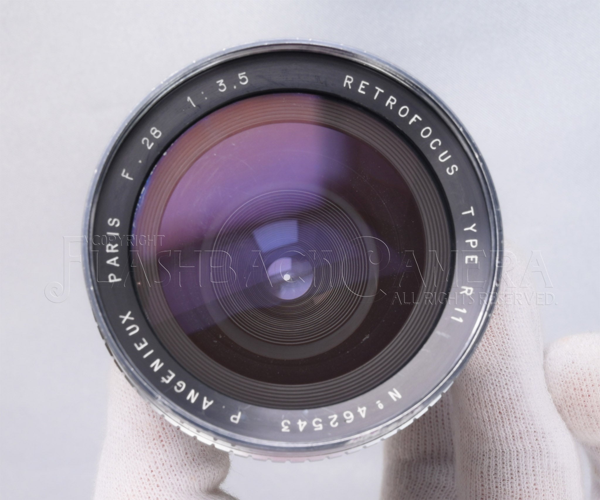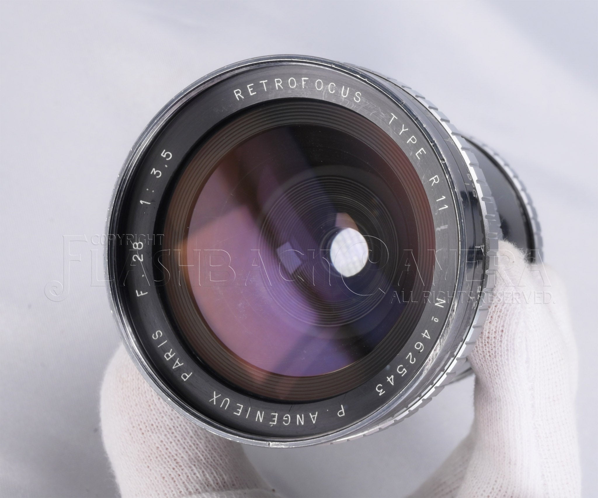 Made by P. Angénieux in France. Manufactured in 1957. Rangefinder-coupled. Distance scale in meters. A retrofocus design with 6 elements in 6 groups, featuring a beautiful purple-tinted coating.