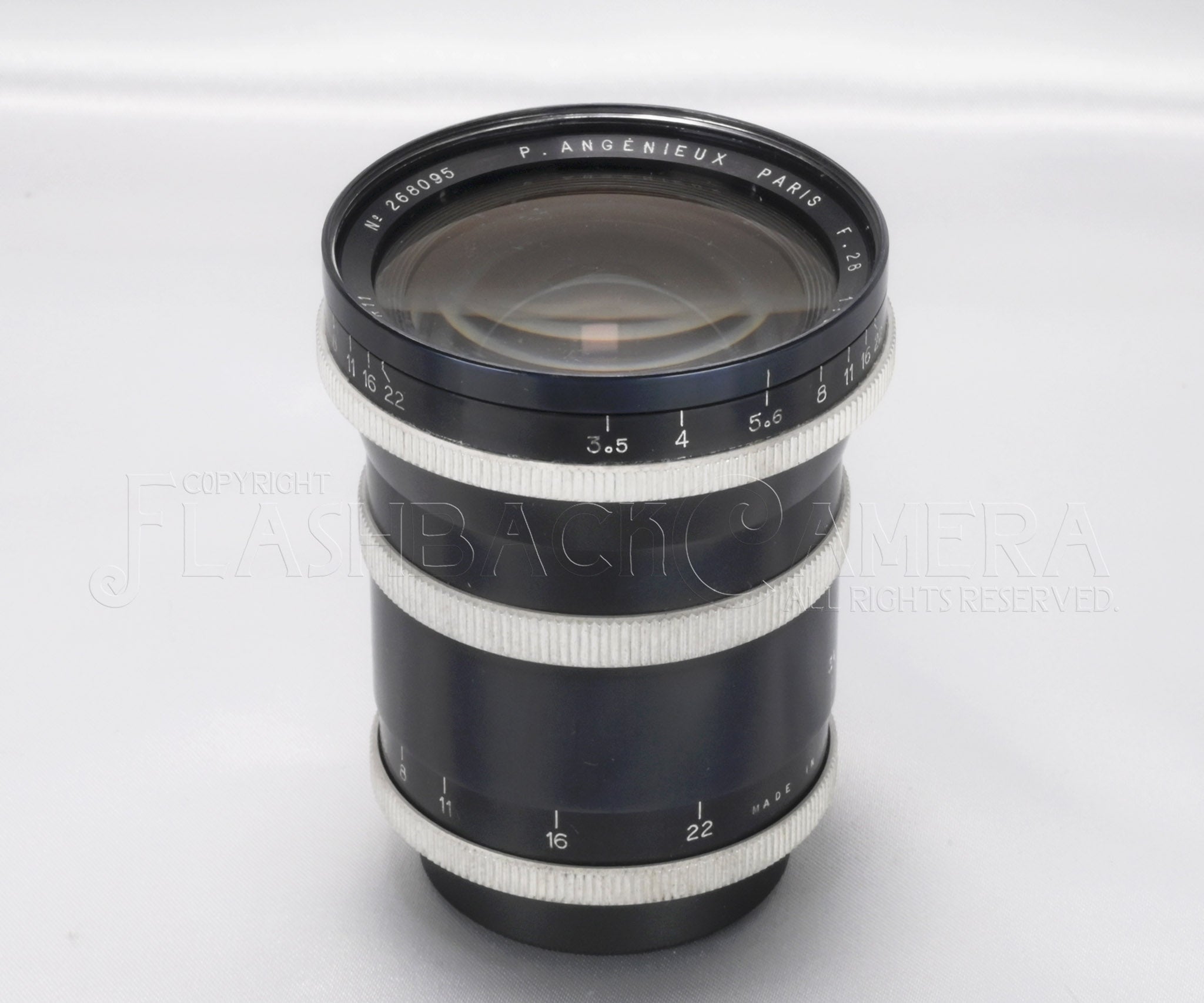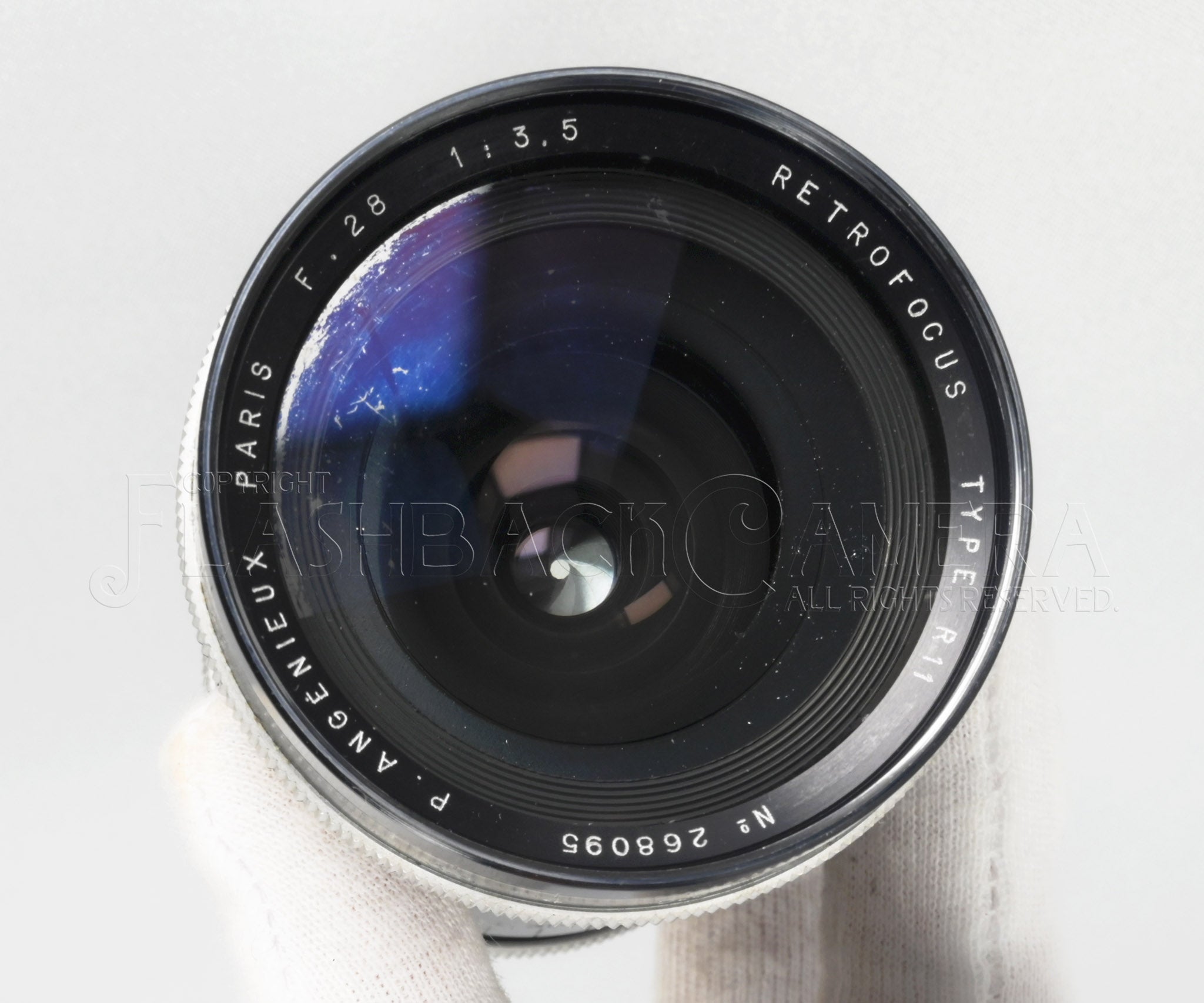 Angenieux 28mm f3.5 Type R11, Leica screw mount. This example is the early version, made by P. Angenieux in France in 1953. Rangefinder-coupled, with distance scale in feet. Retrofocus design, 6 elements in 6 groups, featuring beautiful purple and blue coatings.