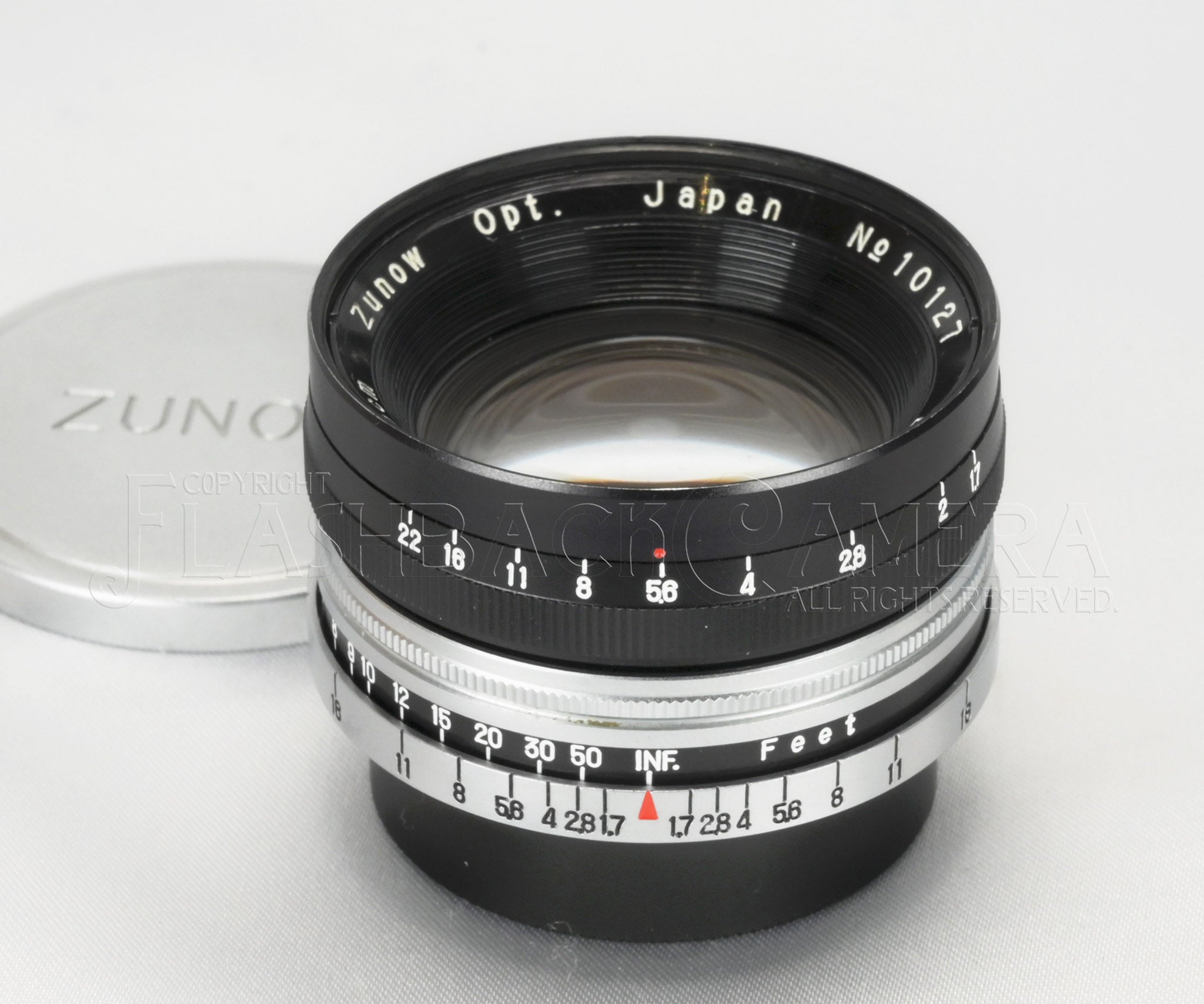 Zunow 35mm f1.7. Leica screw mount. Coupled to the rangefinder. Introduced around 1955 as the first wide-angle lens by Zunow Optical Industry. This example is the later black-barrel version, engraved Zunow Opt. The earlier version was finished entirely in chrome. Distance scale in feet.