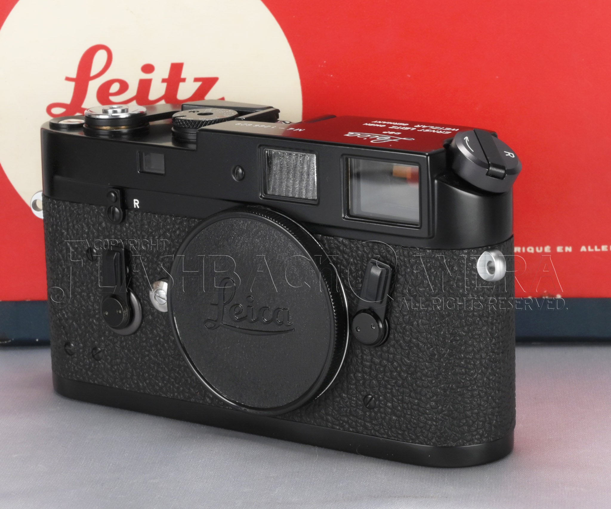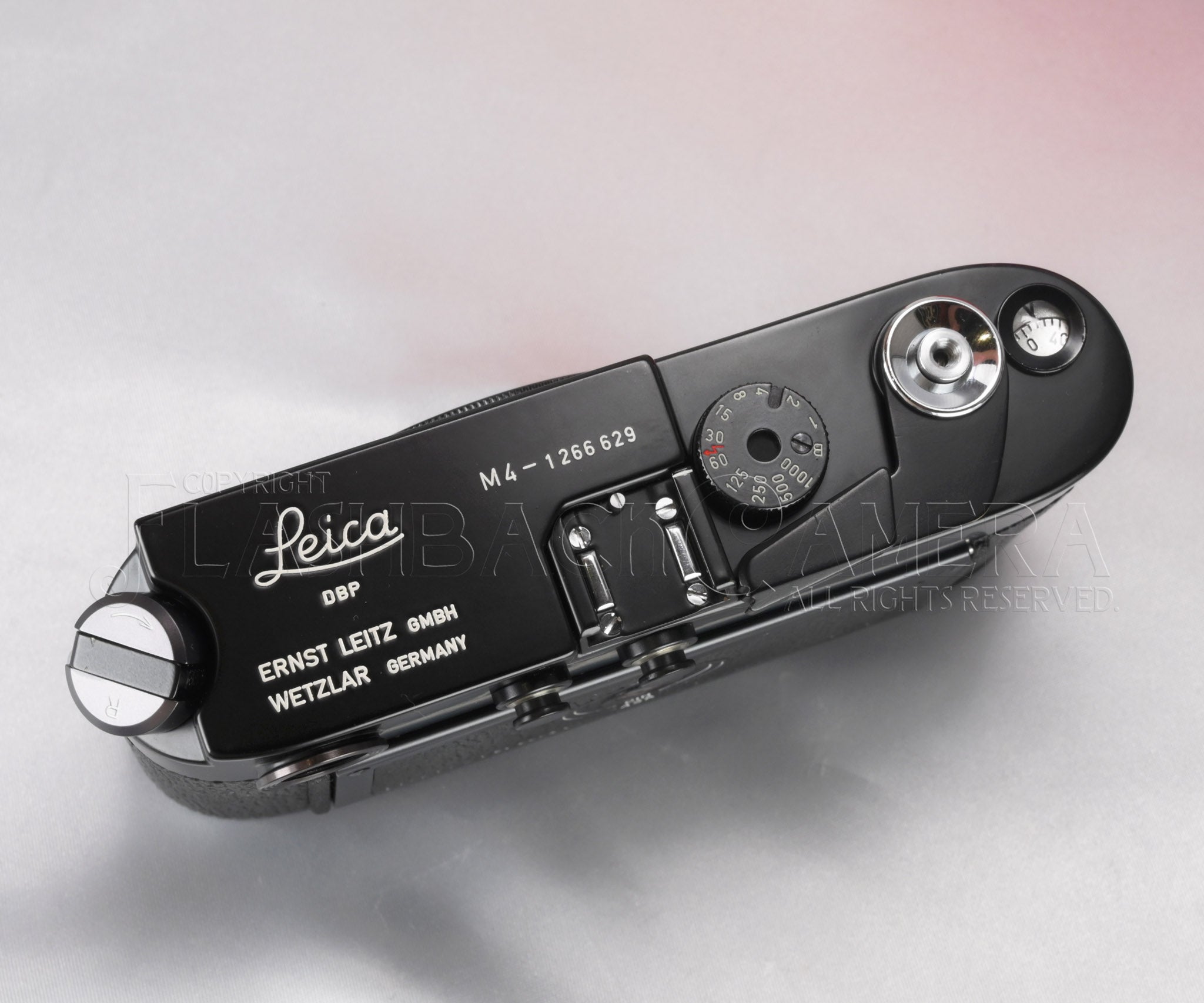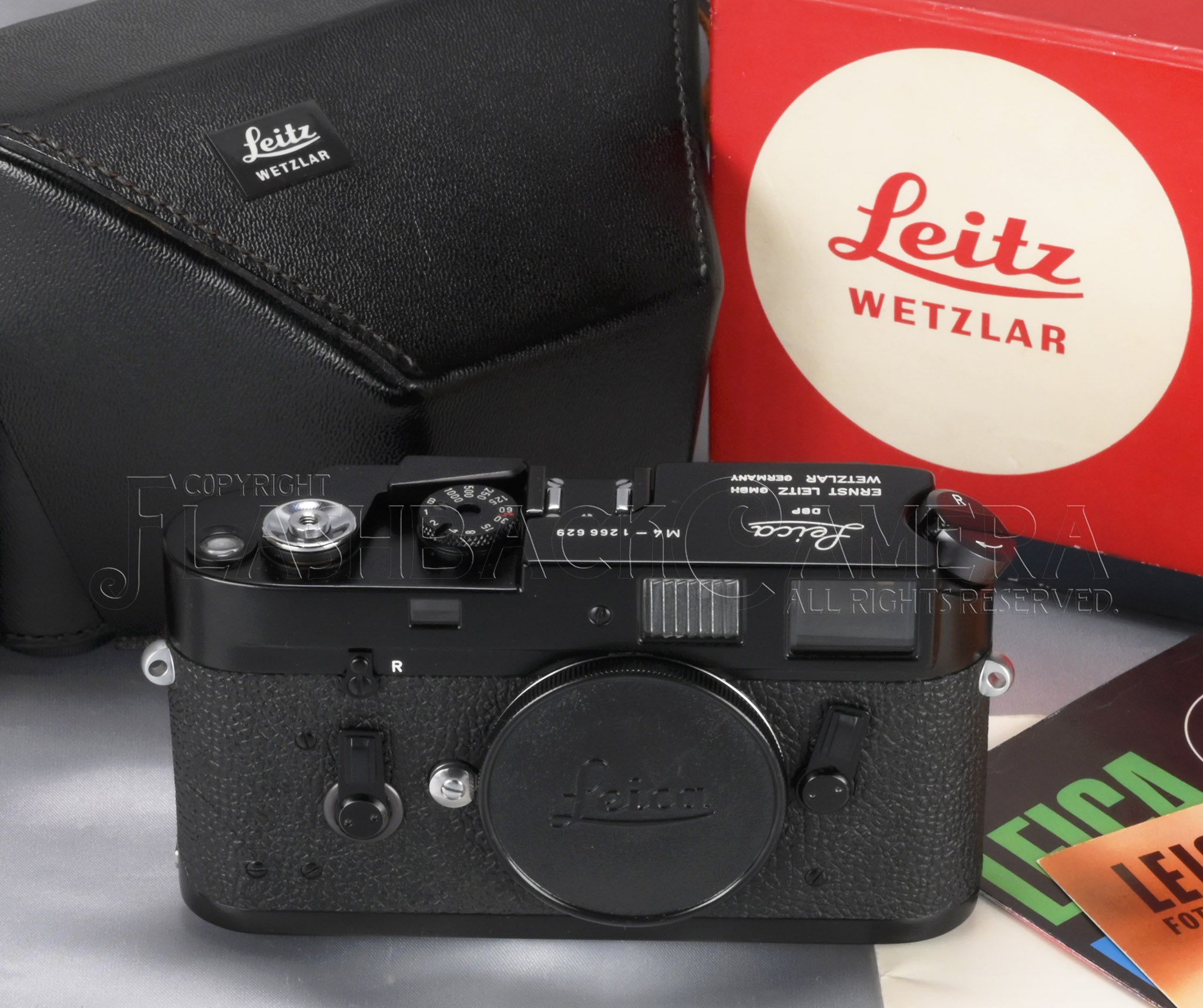 Leica M4 Black Paint. The Leitz product code is 10402. This example bears a serial number in the 1.26 million range and was delivered on June 11, 1970. Near-mint condition. The beautifully preserved semi-gloss black paint is simply mesmerizing.