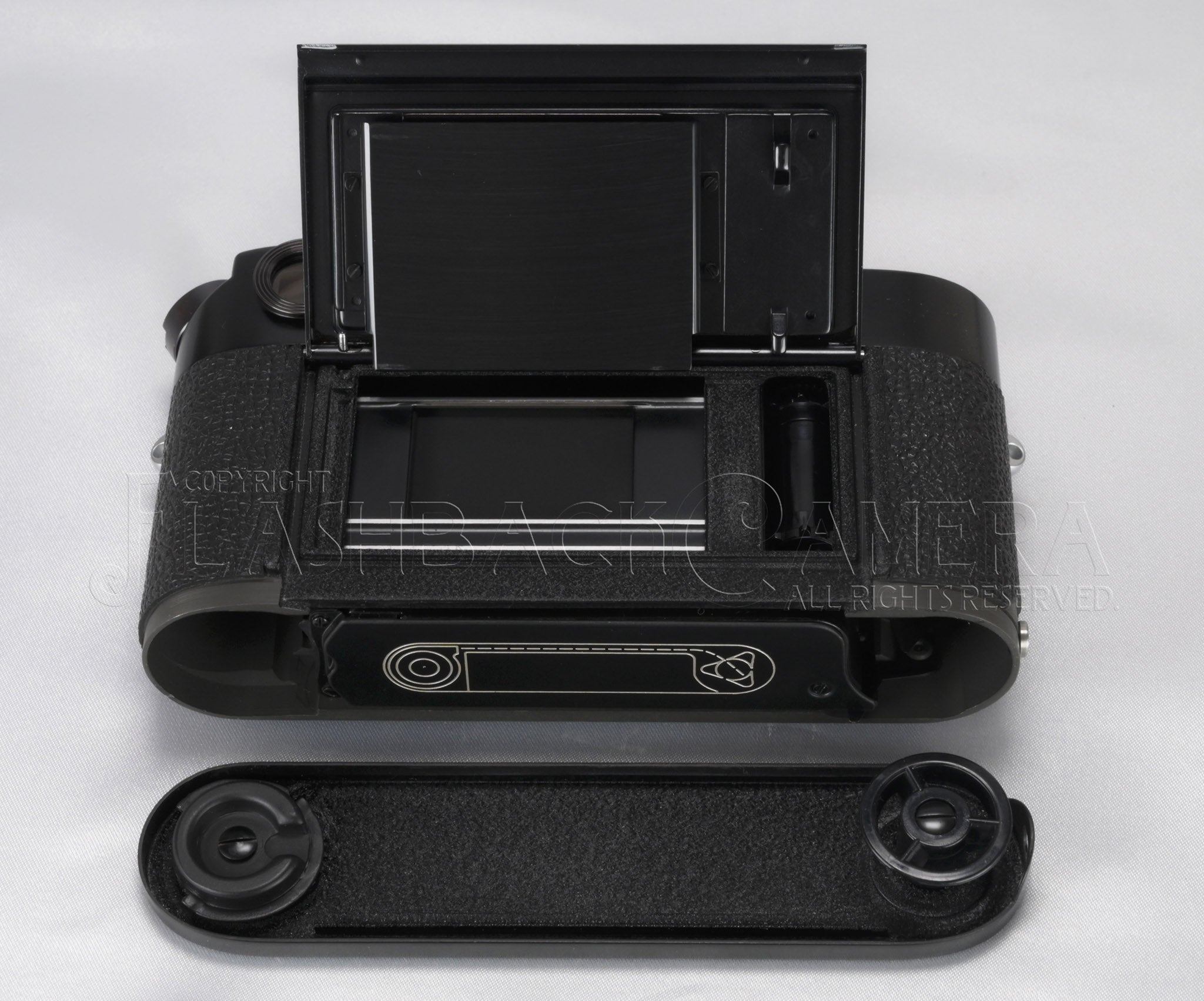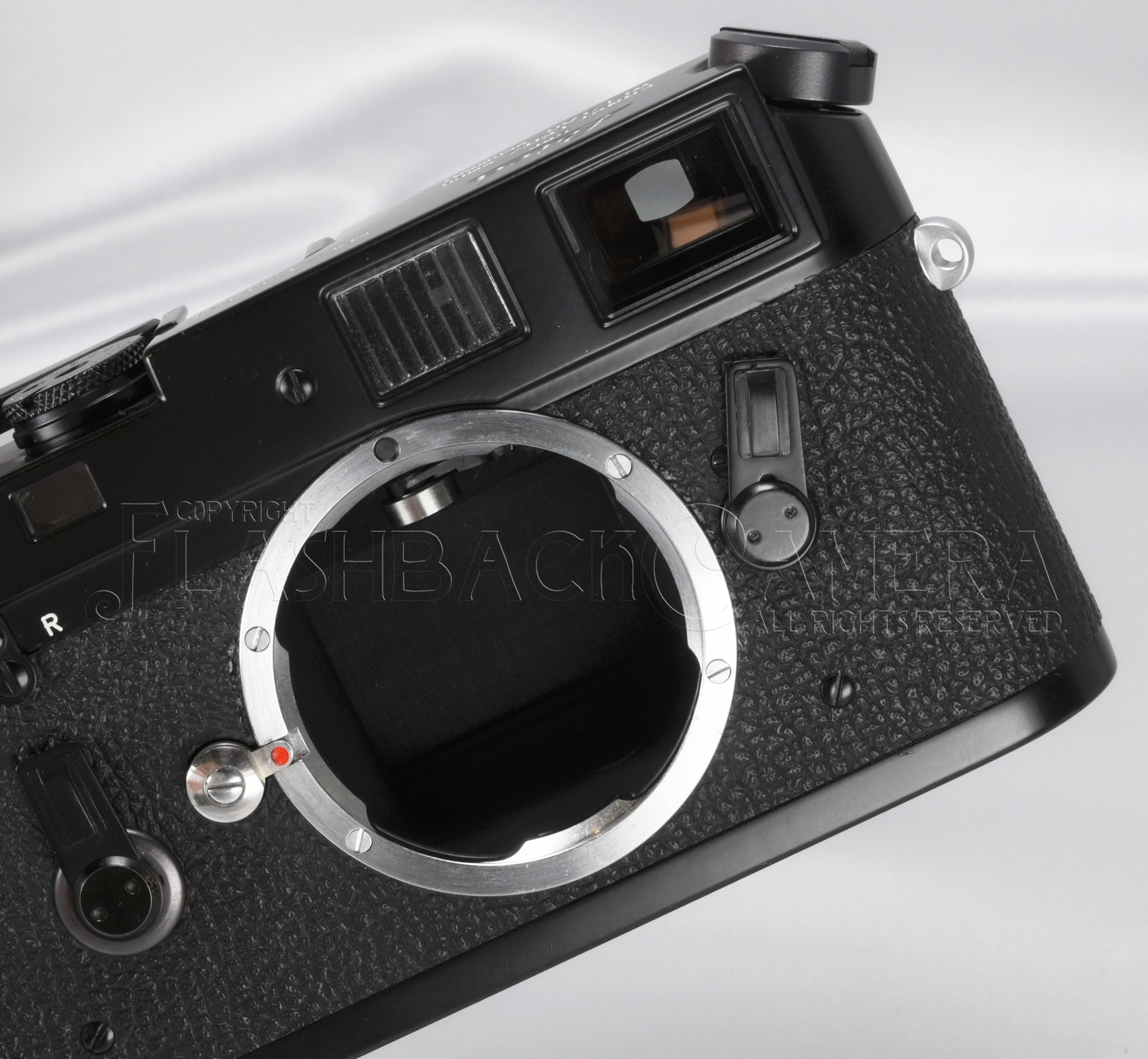 A like-new example with no signs of use. It feels as if this M4 black paint has traveled by time machine from the year of the previous Osaka Expo in 1970 to the year of this year’s Osaka Expo. There is a tiny mark at the 4 o’clock position on the lens mount, two fine scratches about 2 mm long on the plastic part of the advance lever, and a very slight paint loss at the base of the rewind crank. Aside from these, the strap lug area, bottom plate, and overall condition clearly indicate that it has not been used for actual shooting and was only lightly handled for basic operation.