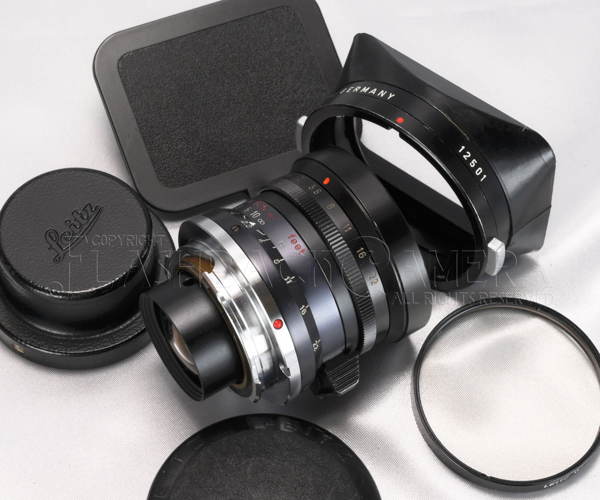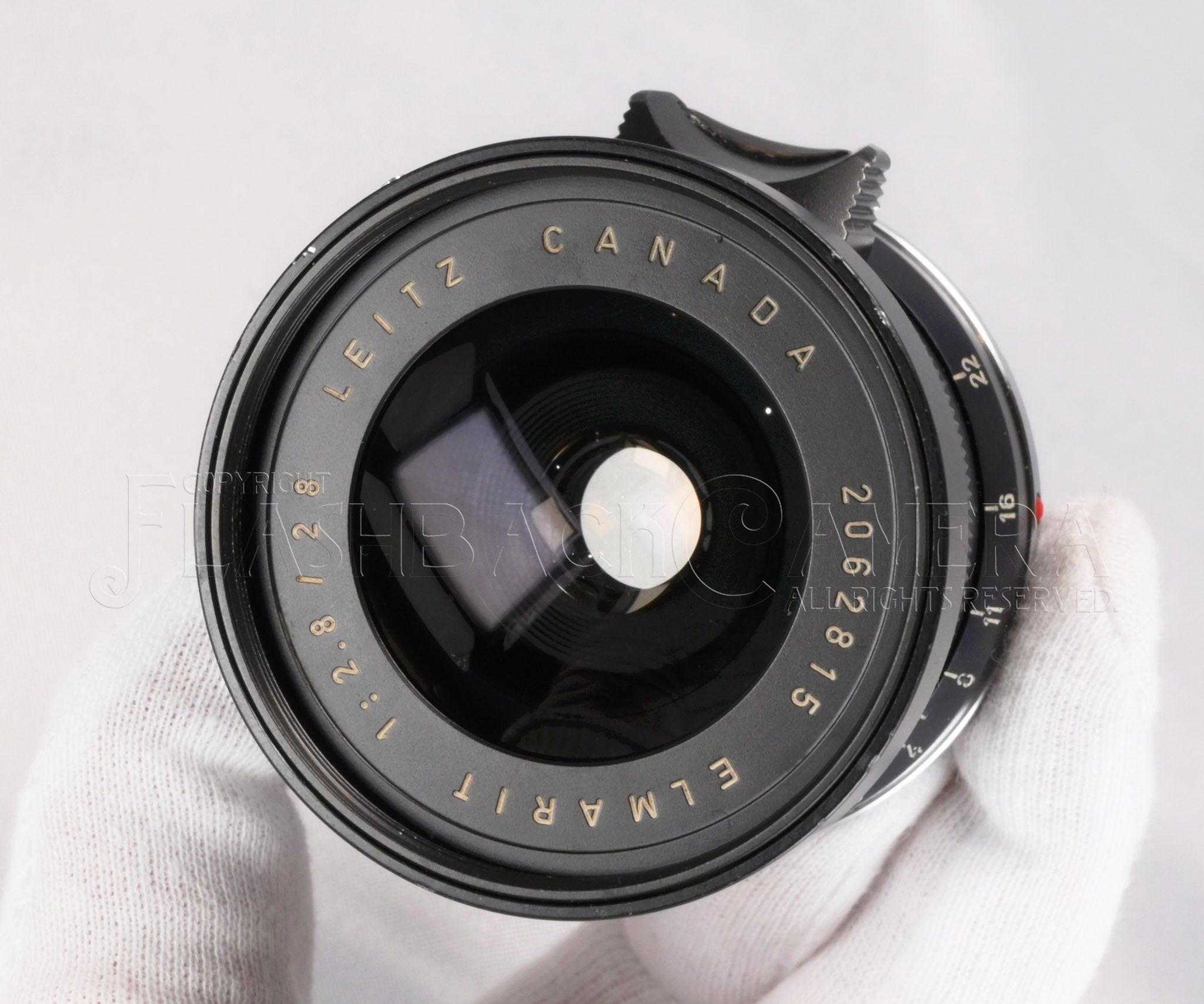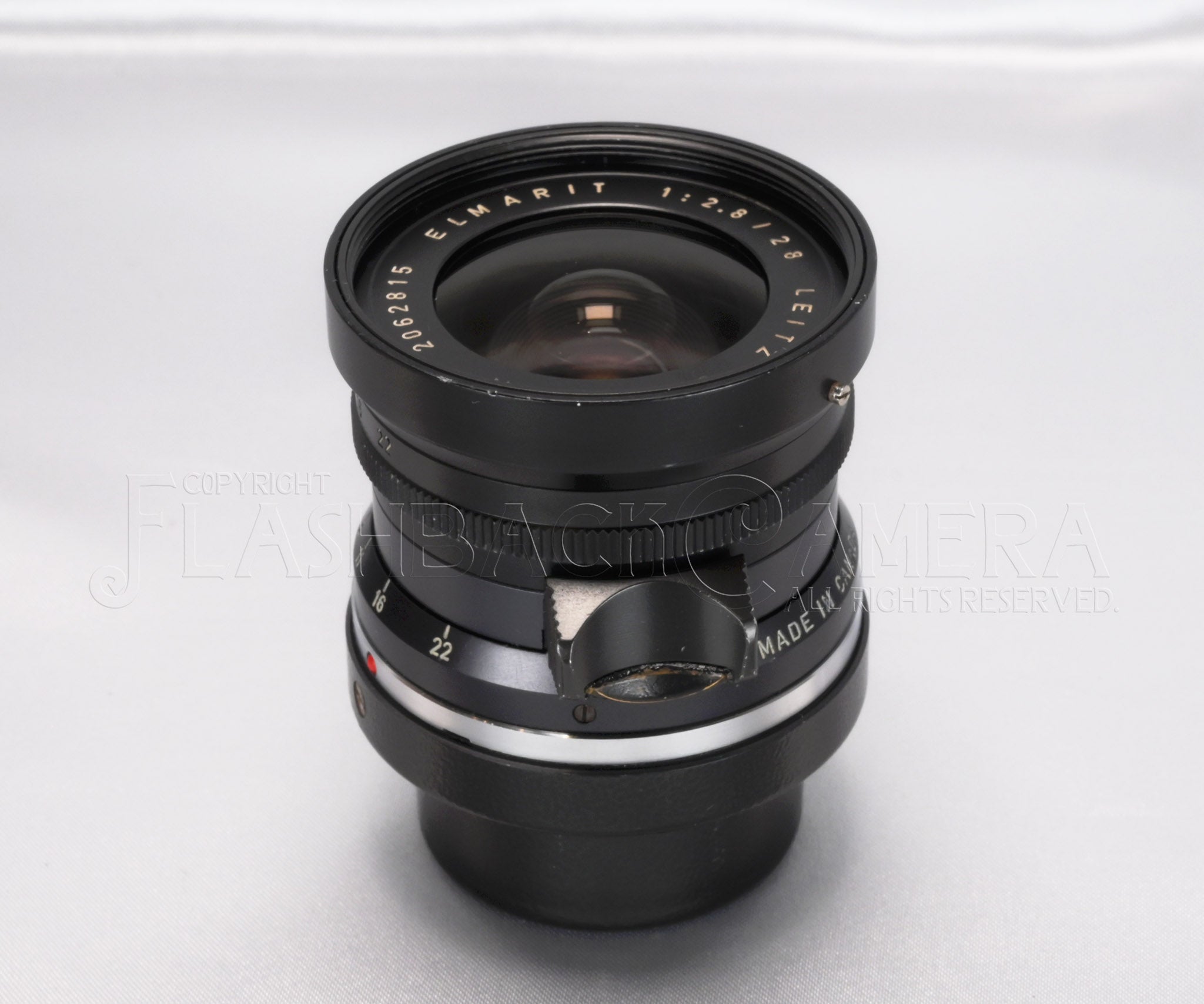 The first-generation Elmarit 28mm f2.8, early version, commonly known as the 9-element. A highly sought-after red scale variant. This example was made in Canada. Leitz product code 11801. Serial number in the 2,060,000 range, manufactured in 1964. A non-retrofocus design with 6 groups and 9 elements. Minimum focusing distance is 0.7m.