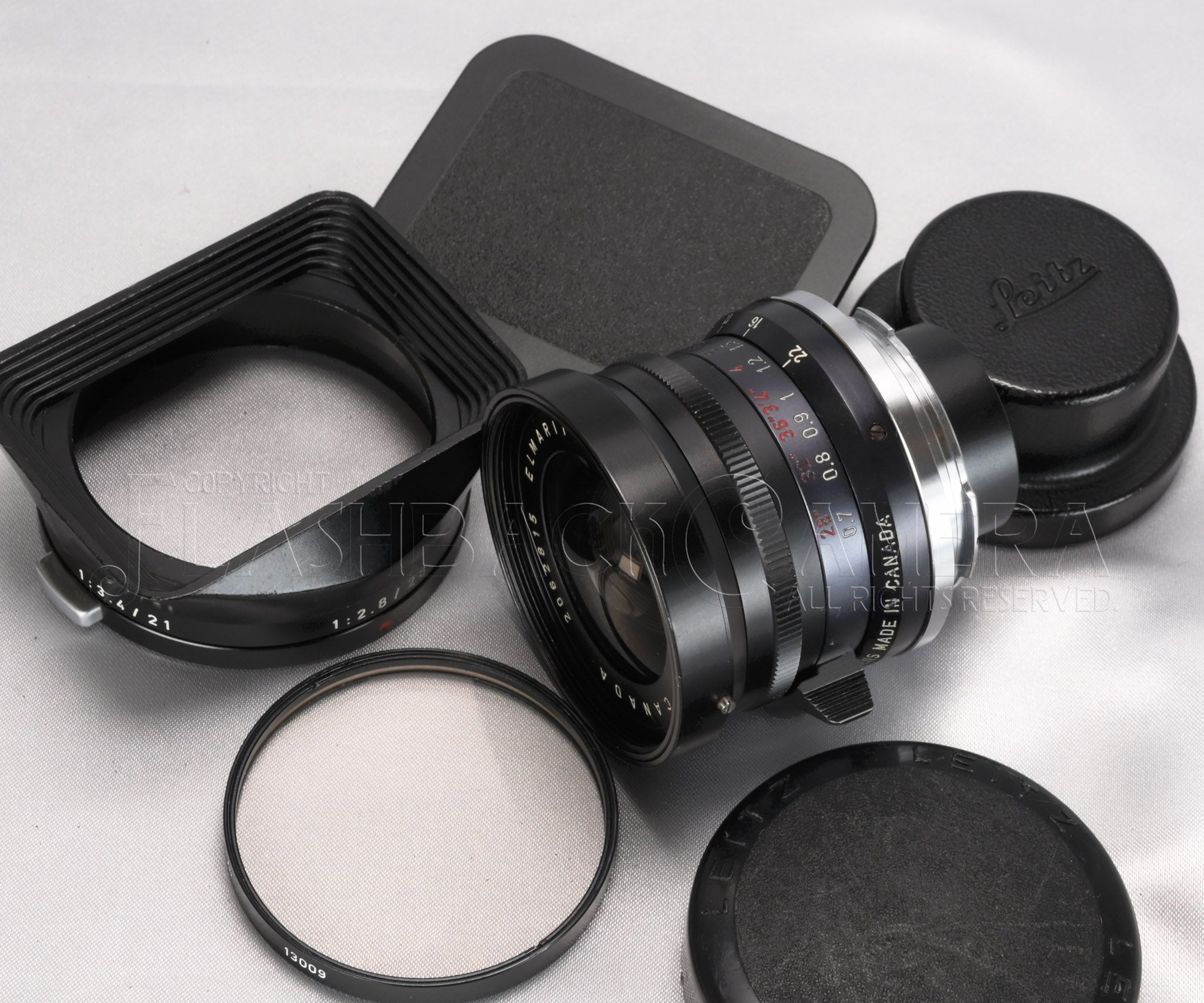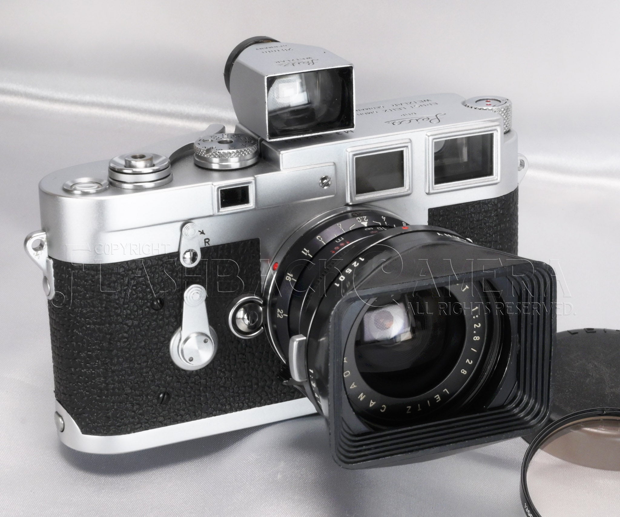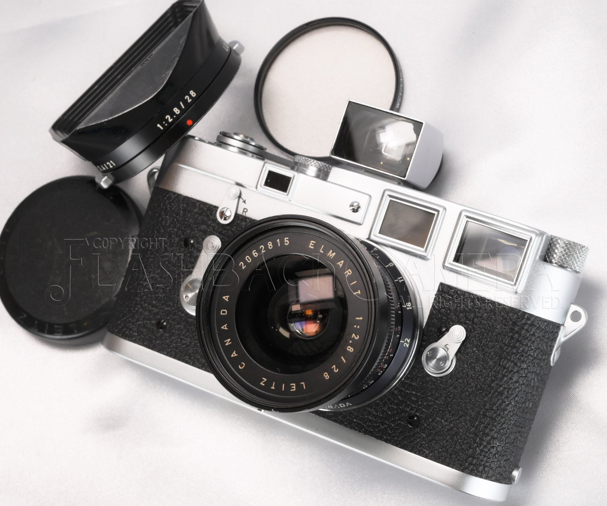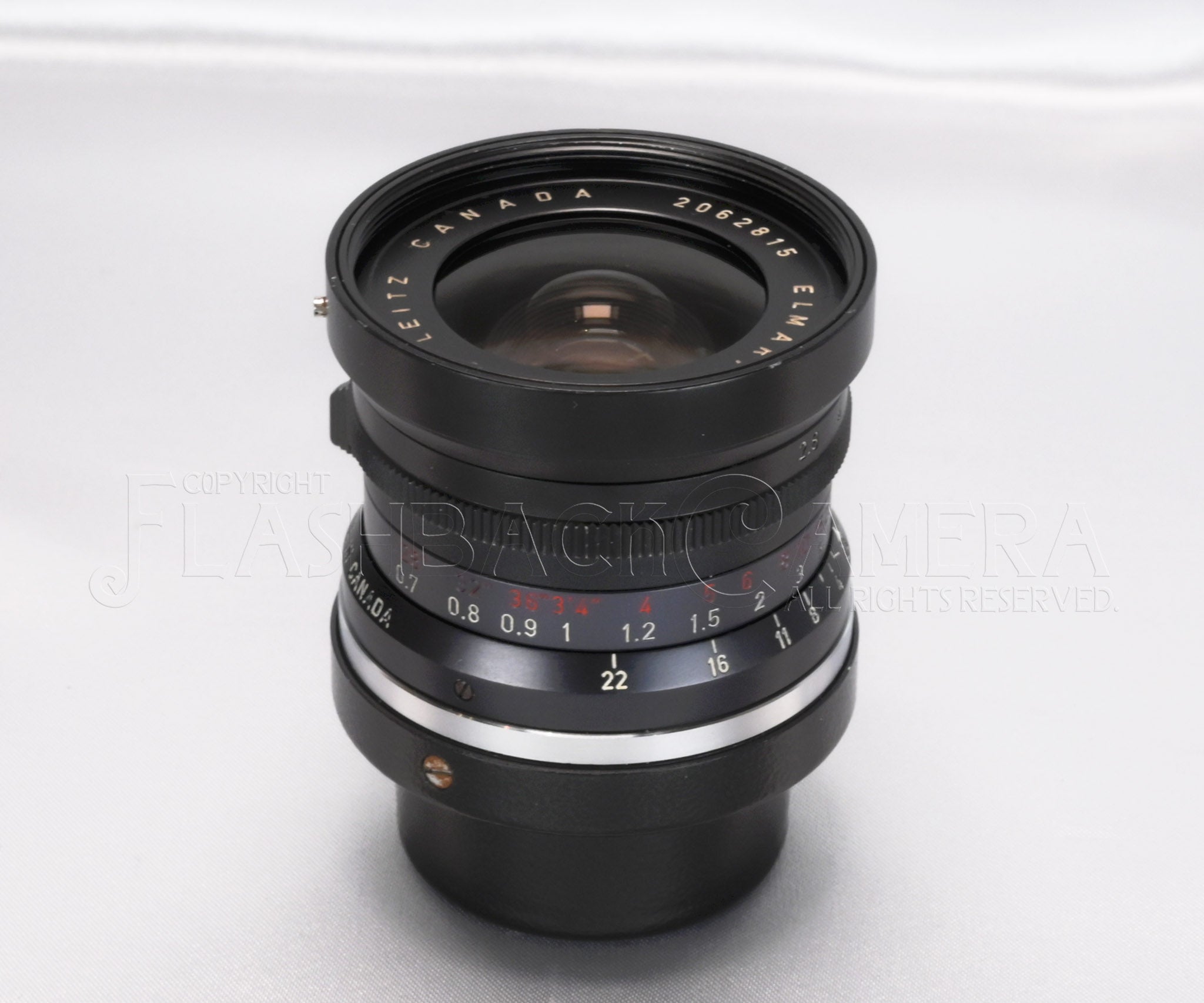 The first-generation Elmarit 28mm f2.8, early version, commonly known as the 9-element. A highly sought-after red scale variant. This example was made in Canada. Leitz product code 11801. Serial number in the 2,060,000 range, manufactured in 1964. A non-retrofocus design with 6 groups and 9 elements. Minimum focusing distance is 0.7m.
