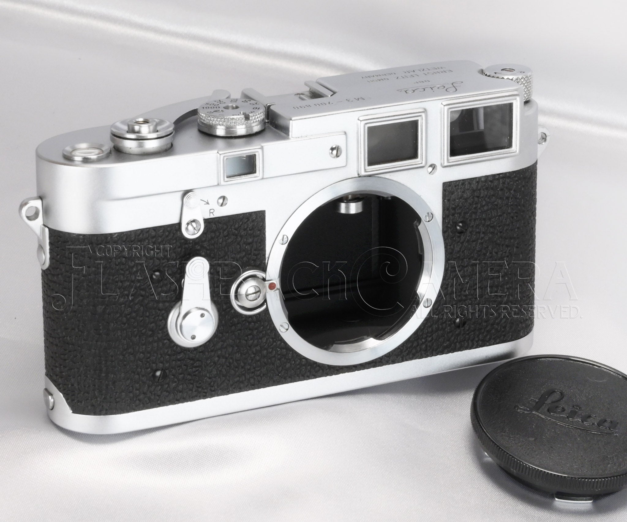 Although this example is not a so-called step body, step and non-step bodies were intermixed from the very first single-digit M3 serial numbers. This camera retains many early features throughout and remains in fully original condition. The number engraved on the inside of the base plate matches the top cover.