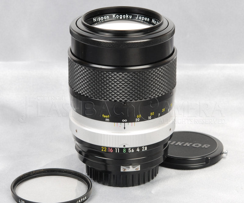 22万台。非Ai。ガラス、外観共にとても綺麗です。ヘリコイド、絞りの感触もスムース。フード内蔵型で、内側にベルベットが貼られるなど、非常に手の掛かった作りをしています。オーソドックスなレンズですが、ここまで綺麗なものはなかなか見つからないでしょう。綺麗なニコン Fとセットで並べたい一本。リアキャップは日本光学KK銘、前キャップはNIKKOR銘です。