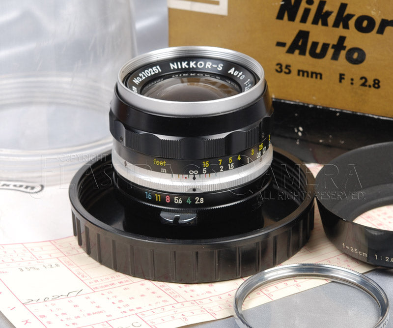 21万台。非Ai。製造本数は非常に多いレンズですが、日本国内正規品で、元箱、愛用者登録カード(シリアル合致)、カード郵送用の封筒(15円切手付)まで揃っています。フィルター、フードも純正品で、大切に保管されてきたのでしょう。箱付のニコン Fと並べれば、気分は昭和にタイムスリップ。