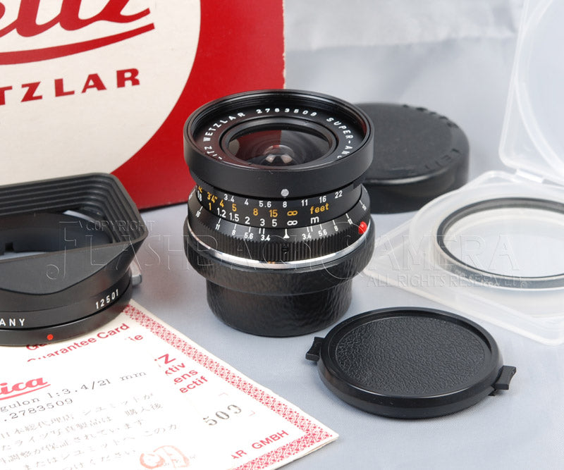 11103。278万台。1976年製。とても綺麗なスーパー・アンギュロン 21mm。後玉がかなり出っ張っているため、アダプターを用いてミラーレスデジタル等に装着される場合、接触にご注意下さい。最短撮影距離は0.4mですが、距離計の連動は1mまでとなります。また、露出計内蔵ライカでは正常に測光できないため、マニュアル操作となります。シュミットの正規輸入品。元箱のアンコが無くなっている他は、紙モノも揃った見事なセットです!