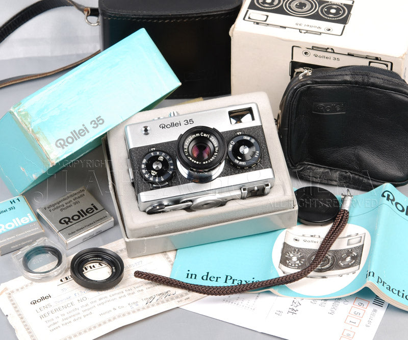 ドイツ製。クローム仕上げ。日本正規輸入品。紙モノ、純正ハードケース(固定ネジは社外品)まで揃った、見事なセットです。作動快調。レンズは少々チリが混入しています(別途清掃承ります)。露出計は関東カメラ製1.35V変換アダプタ使用で作動OK。ドイツ製ローライ 35としては申し分ないコンディションだと思います。外箱やユーザー登録証、各種の元箱まで揃った稀少なセット。委託品。