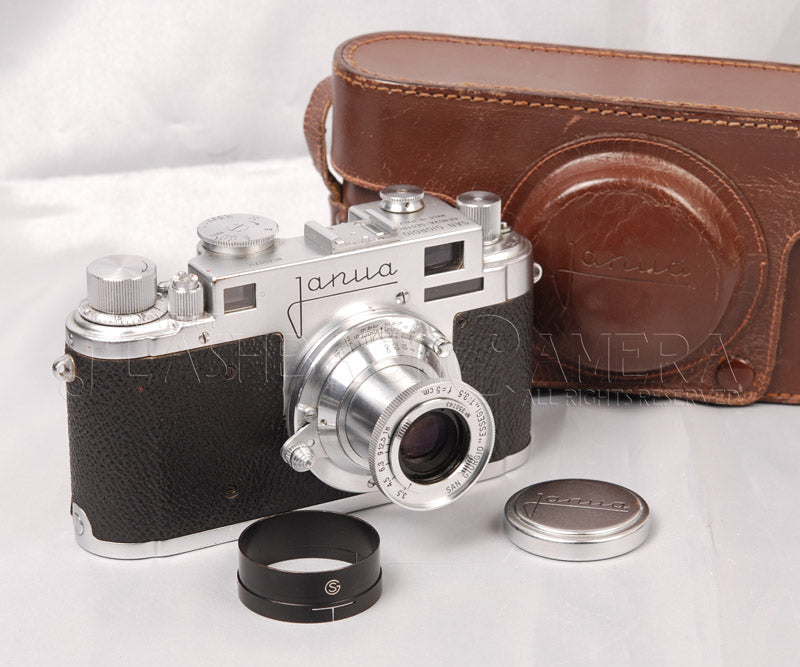 イタリアのSan Giogiro社が、1949年頃に製造した35mmレンジファインダー・カメラ。長基線長連動距離計、光学露出計、1/1000シャッター、一軸不回転シャッターダイアル、セルフタイマーなど当時ライカにも無かった機構も盛り込んだ意欲機。イタリア人設計者の心意気を感じます。レンズはヤヌア専用のバヨネット・マウントで、厳密にはライカコピーとは言えませんが、数あるライカ型カメラの中でも傑出したスタイルで風格を感じます。Essegiレンズの描写も大変シャープで定評があります。純正のかぶせフード付。
