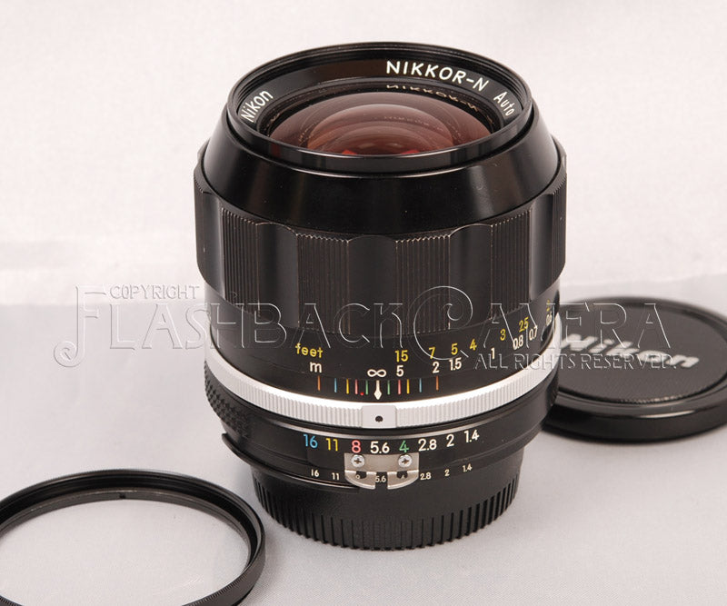ニコン Fマウントのハイスピード広角レンズ。7群9枚構成。絞り羽根は9枚。ニコンのレンズでは数少ないトリウムレンズを採用したもの。ガイガー・カウンターの反応確認済。ガラスは例によって少々黄ばんでいます。外観はローレット部分に僅かな塗装落ちが見られますが、全体的には綺麗です。ガラスは中玉にごく僅かなチリの混入が見られます。実写への影響はないでしょう。ヘリコイドと絞りの感触も良く、トリウム入りニッコールとしては全体的に良い状態です。