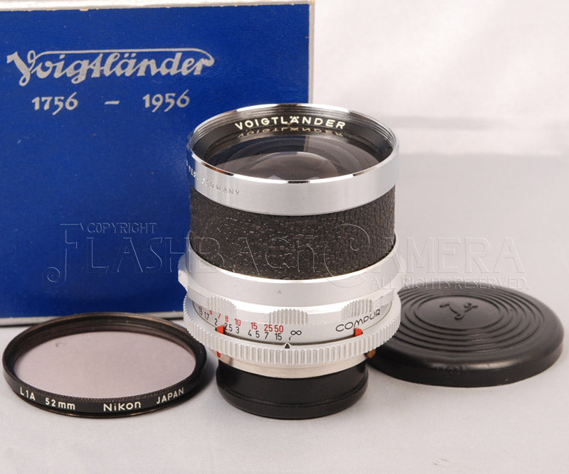 フォクトレンダーの一眼レフ、ベッサマチック用の準広角大口径レンズです。1961年の発売。6群9枚構成のレトロフォーカス・タイプ。戦後フォクトレンダーの全盛期らしい、重量感のある堂々たるつくりです。発売当初は大変高価であまり売れず、現在ではレアなレンズに。フィルター径は54mmかぶせでSepton 50mm f2と共用、または汎用の52mmねじこみです。ドイツ仕入物件です。