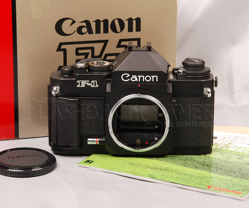 新品同様。大変綺麗なキヤノン ニューF1です。1971年発売のキヤノンF-1の後継機の10年後、1981年に登場しました。測光機能の多様化、自動化機能充実を図りつつ、操作の基本は初代F-1を踏襲することでニューF-1を違和感無く操作できるように配慮されていました。こちらの個体には、元箱、当時のレンズガイドブック、アクセサリー案内、キヤノンクラブへのお誘い、の書類が付属致します。