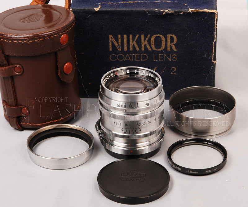 1948年発売。ニッコール P.C 8.5cm f2の前期型、白鏡胴です。ニコンSマウント。3群5枚構成、コンタックス用ハチゴゾナーのコピー。10枚羽根の円形絞り。ズシリと重い、大変丁寧なした作りのレンズです。開放ではやや柔らかいが、f4付近まで絞り込むと一気に鮮鋭な描写に。D.D.ダンカン氏が朝鮮戦争で使用(ライカ・スクリューマウント版)し絶賛、日本製レンズの優秀さを世に知らしめるきっかけとなった記念碑的レンズです。
